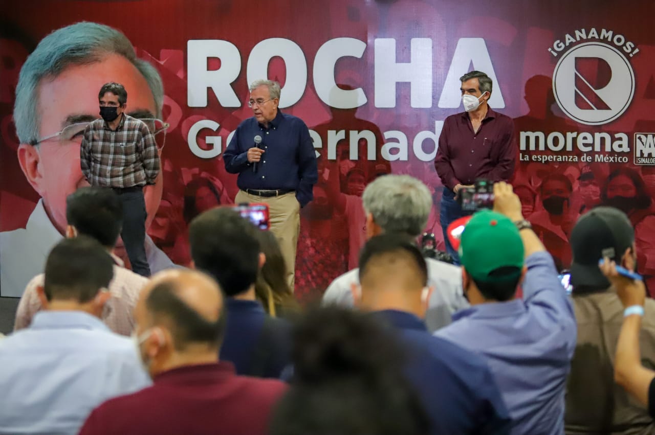 Rubén Rocha Moya estuvo acompañado en la conferencia del triunfo por sus hijos: Eneyda, Rubén, Ricardo y José Jesús; así como por la senadora Imelda Castro Castro y la secretaria nacional de Mujeres de Morena, Carol Arriaga.