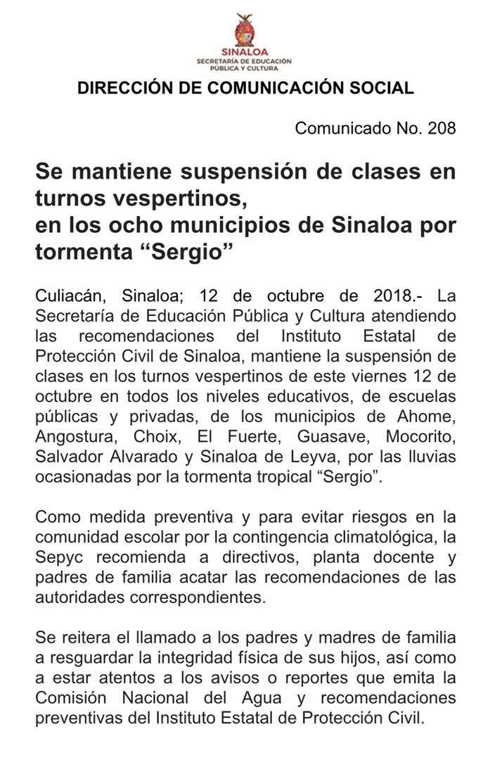 Culiacán, Sinaloa; 12 de octubre de 2018.- La Secretaría de Educación Pública y Cultura atendiendo las recomendaciones del Instituto Estatal de Protección Civil de Sinaloa, mantiene la suspensión de clases en los *turnos vespertinos de este viernes 12* de octubre en todos los niveles educativos, de escuelas públicas y privadas, de los municipios de *Ahome, Angostura, Choix, El Fuerte, Guasave, Mocorito, Salvador Alvarado y Sinaloa de Leyva*, por las lluvias ocasionadas por la tormenta tropical “Sergio”.