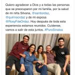 “Quiero agradecer a Dios y a todas las personas que se preocuparon por mi familia, por la salud de mi niña Silvana, @santiordaz, @quirinoordaz y de mi esposa @RosyFdeOrdaz. Hoy después de toda esta experiencia estamos reunidos. Cuídense, vamos a salir de esta juntos. #PuroSinaloa” se lee en el mensaje vía Twitter.