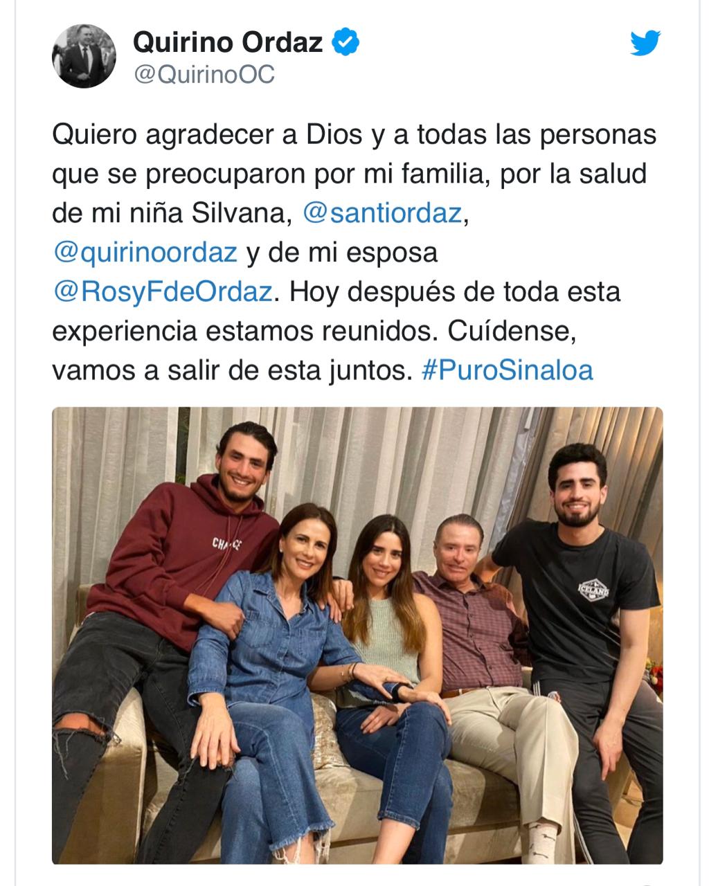 “Quiero agradecer a Dios y a todas las personas que se preocuparon por mi familia, por la salud de mi niña Silvana, @santiordaz, @quirinoordaz y de mi esposa @RosyFdeOrdaz. Hoy después de toda esta experiencia estamos reunidos. Cuídense, vamos a salir de esta juntos. #PuroSinaloa” se lee en el mensaje vía Twitter.