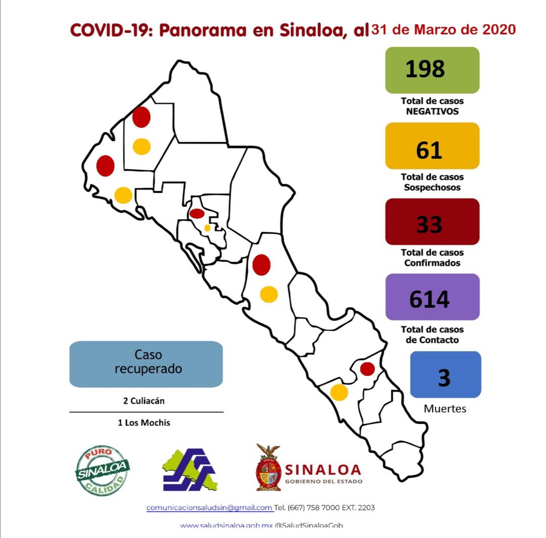 El número de decesos se mantiene en 3, por lo que el total de pacientes, entre activos, dados de alta y fallecidos, llegan a 33 en el histórico de Sinaloa.