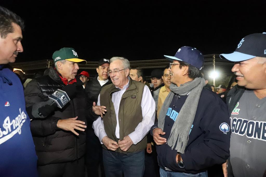 Guasave, Sinaloa, a 24 de enero de 2023.- A su arribo a las instalaciones del Kuroda Park, estadio anfitrión del tercer juego de la serie final de la Liga Mexicana del Pacífico, que está enfrentando a los Cañeros de Los Mochis contra los Algodoneros de Guasave, el Gobernador Rubén Rocha Moya fue abordado por aficionados de ambos equipos, quienes con visible emoción le pedían definirse por alguno de los dos equipos, a lo que con una amplia sonrisa respondió reiteradamente «Sinaloa es mi equipo», lo cual generó aplausos y risas de ambos bandos.