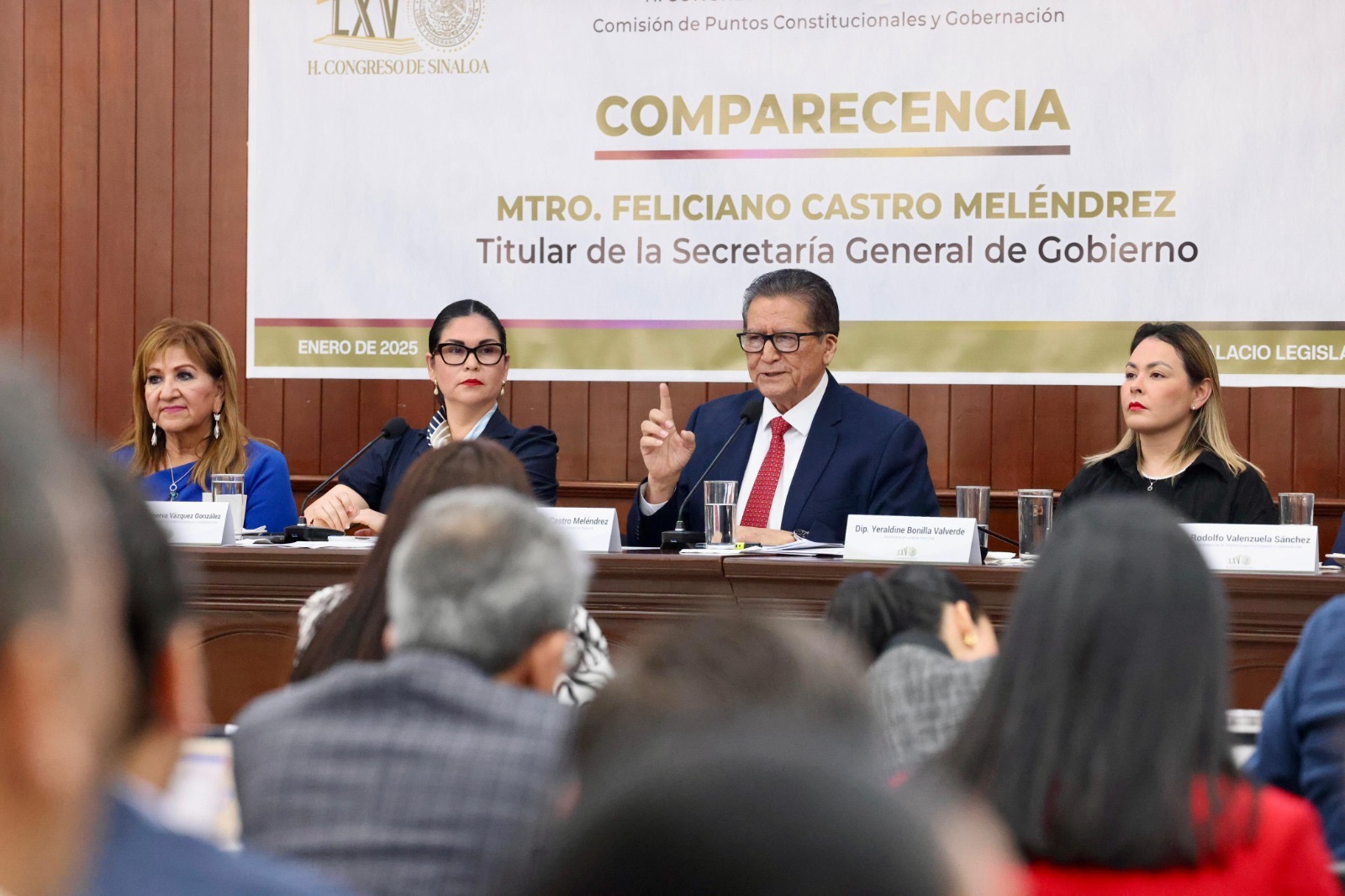 Culiacán, Sinaloa, a 27 de enero de 2025.- Ante las y los diputados de los diversos Grupos Parlamentarios con representación en el Congreso del Estado, el Secretario General de Gobierno, Feliciano Castro Meléndrez, hizo una convocatoria a la construcción de la paz como tarea de todas y todos, según la naturaleza social o política de cada sector o ente de gobierno, para avanzar en torno al objetivo único de regresar la armonía a las y los sinaloenses, reiterando que el Gobierno del Estado y el Gobierno Federal mantienen una estrecha coordinación cuya estrategia ya presenta resultados visibles.
