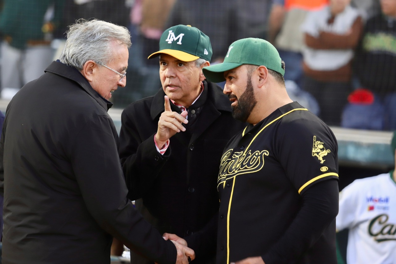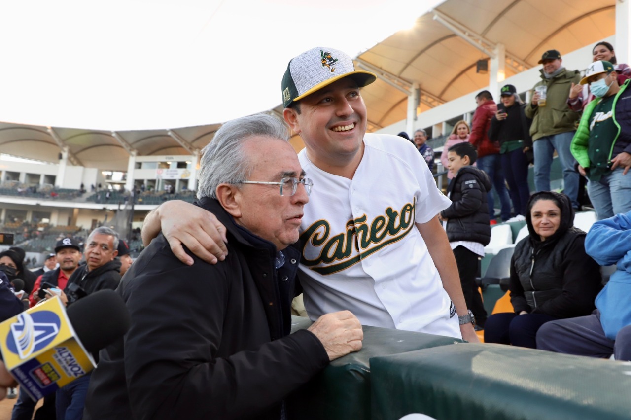 Ahome, Sinaloa, a 21 de Enero de 2023.- El gobernador Rubén Rocha Moya compartió junto con miles de aficionados al béisbol el juego inaugural de la serie final de la Liga Mexicana del Pacífico, que arrancó esta tarde de sábado entre los Cañeros de Los Mochis y Algodoneros de Guasave, en las instalaciones del Chevron Park en la ciudad de Los Mochis, donde como invitado de honor, efectuó el lanzamiento de la primera bola, mismo que fue bateado por el Alcalde de Ahome, Gerardo Vargas Landeros, teniendo como cátcher al Alcalde de Guasave, Martín Ahumada Quintero.