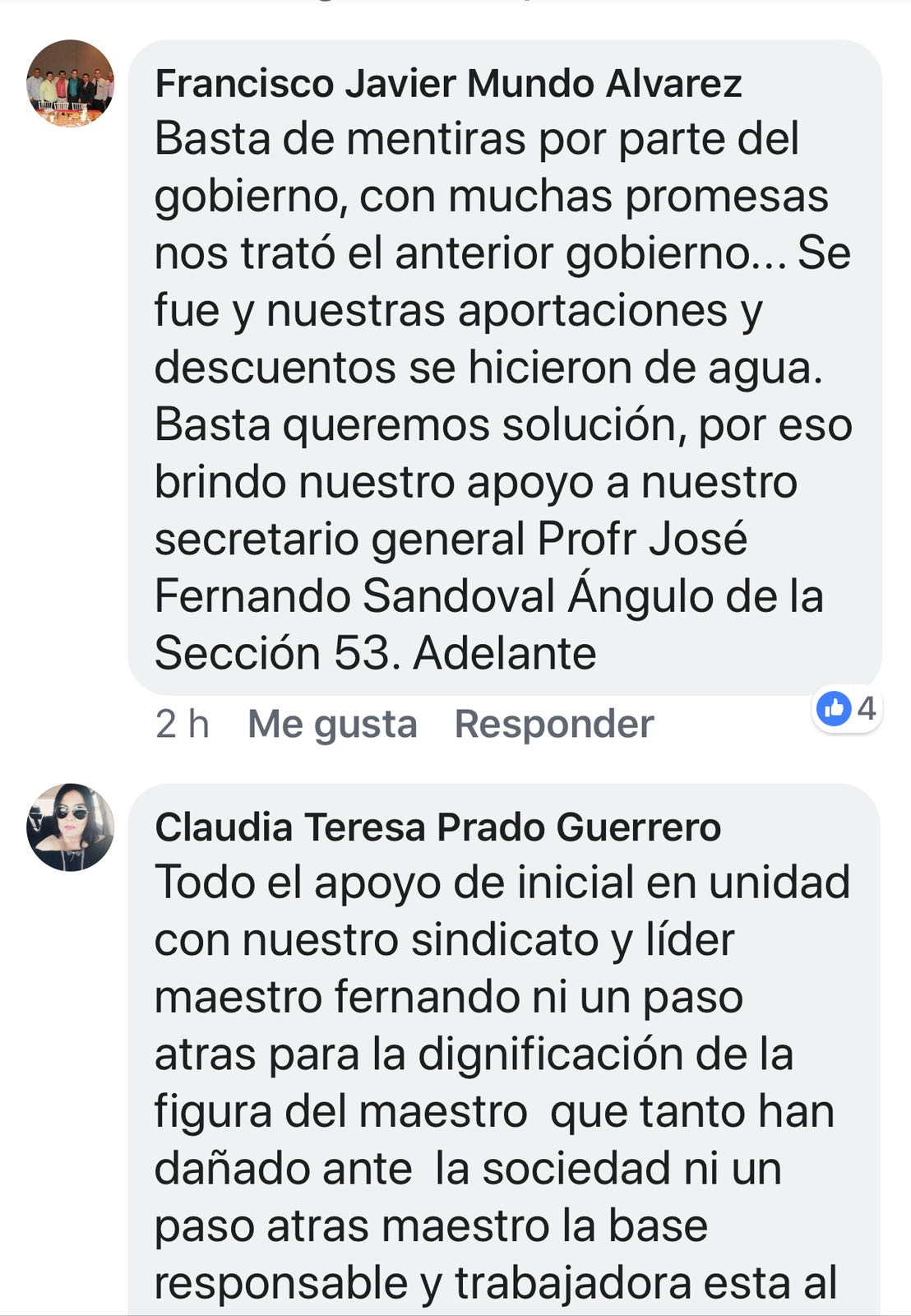 “Basta de mentiras por parte del gobierno, con muchas promesas nos trató el anterior gobierno… Se fue y nuestras aportaciones” y descuentos se hicieron de agua. Basta queremos solución, por eso brindo nuestro apoyo a nuestro secretario general Profr José Fernando Sandoval Ángulo de la Sección 53. Adelante”, dice Francisco Javier Mundo Álvarez.