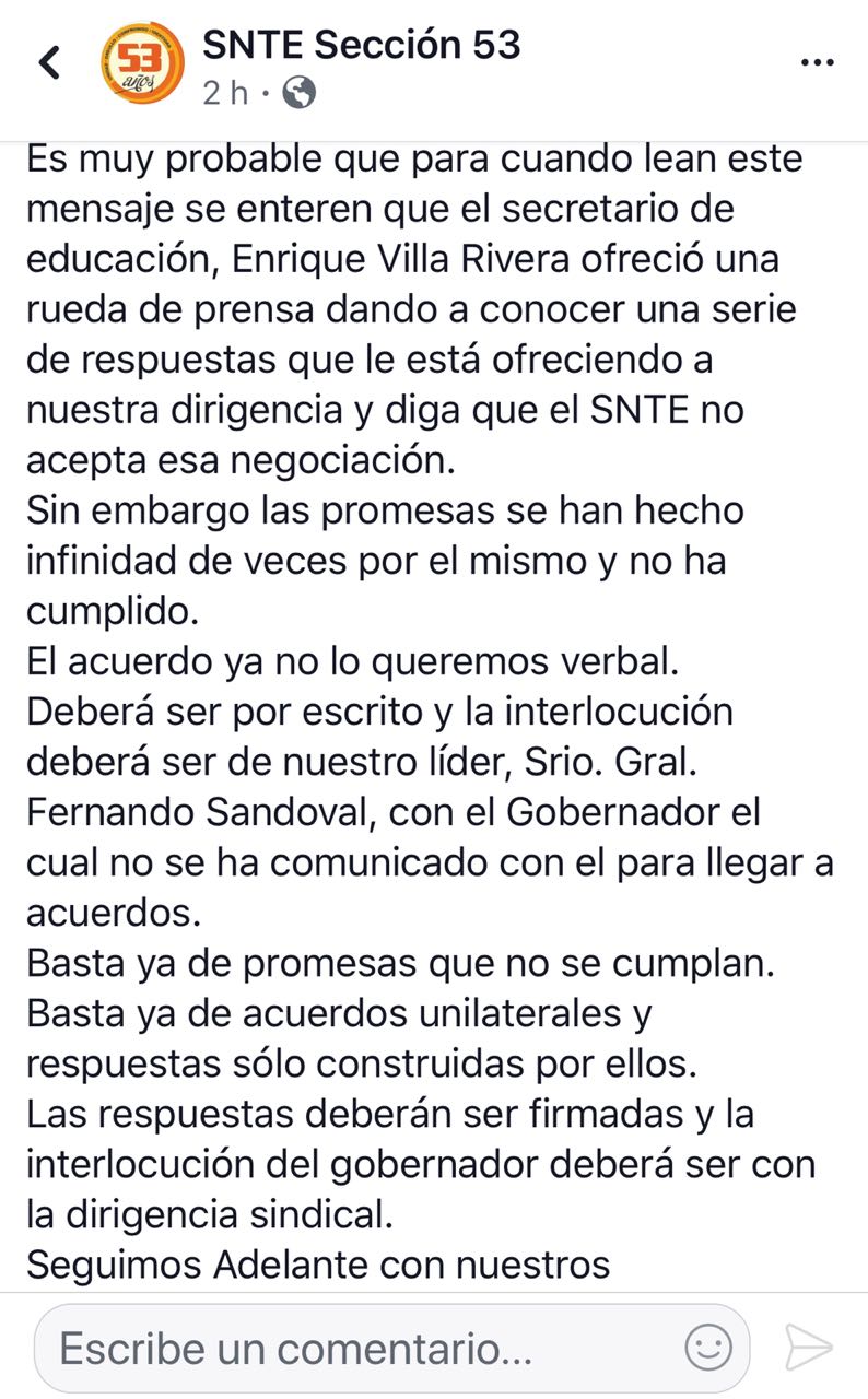“Es muy probable que para cuando lean este mensaje se enteren que el secretario de educación, Enrique Villa Rivera ofreció una rueda de prensa dando a conocer una serie de respuestas que le está ofreciendo a nuestra dirigencia y diga que el SNTE no acepta esa negociación. Sin embargo las promesas se han hecho infinidad de veces por el mismo y no ha cumplido”, indica.