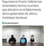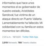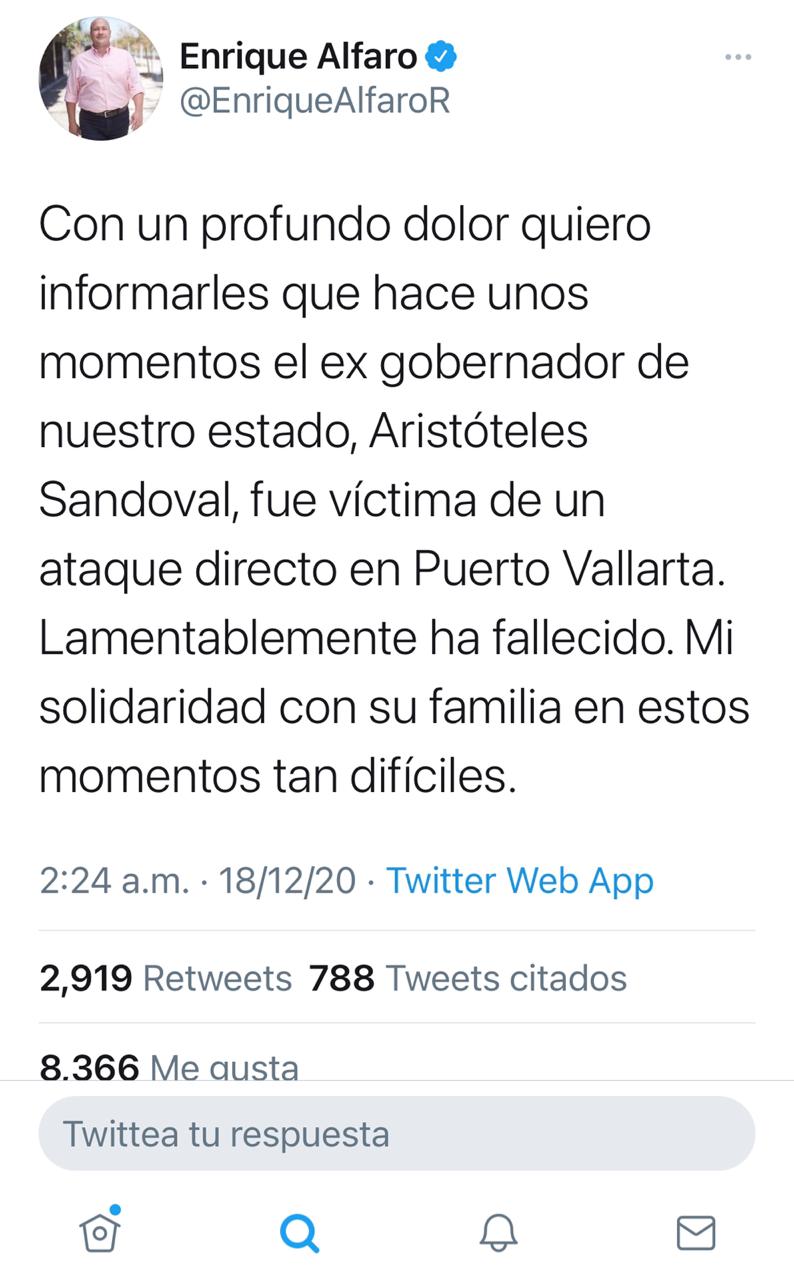 Con un profundo dolor quiero informarles que hace unos momentos el ex gobernador de nuestro estado, Aristóteles Sandoval, fue víctima de un ataque directo en Puerto Vallarta. Lamentablemente ha fallecido. Mi solidaridad con su familia en estos momentos tan difíciles”, publicó Alfaro.