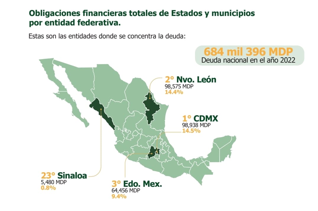 De los 684 mil 396 MDP de obligaciones financieras de estados y municipios a nivel nacional al año 2022, las entidades donde se concentra la deuda son: La Ciudad de México con 98 mil 938 MDP, el 14.5%; Nuevo León con 98 mil 575 MDP, el 14.4% y Estado de México con 64 mil 456 MDP, el 9.4%. Sinaloa, con una deuda de 5 mil 480 MDP, representa el 0.8% del total, ocupando la posición veintitrés.