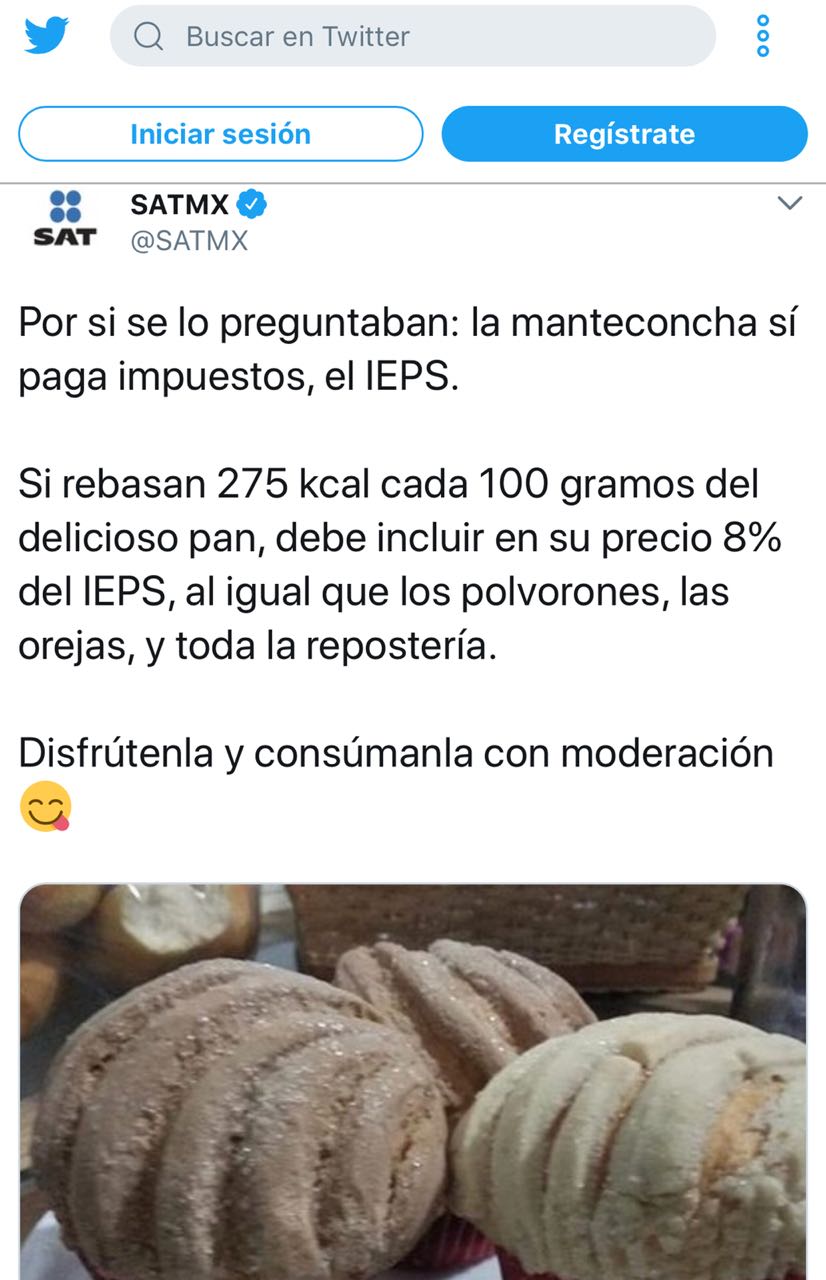 “Por si se lo preguntaban: la manteconcha sí paga impuestos, el IEPS. Si rebasan 275 kcal cada 100 gramos del delicioso pan, debe incluir en su precio 8% del IEPS, al igual que los polvorones, las orejas, y toda la repostería” advierte el SAT en su cuenta oficial de Twitter. Incluso añade, “Disfrútenla y consúmanla con moderación”