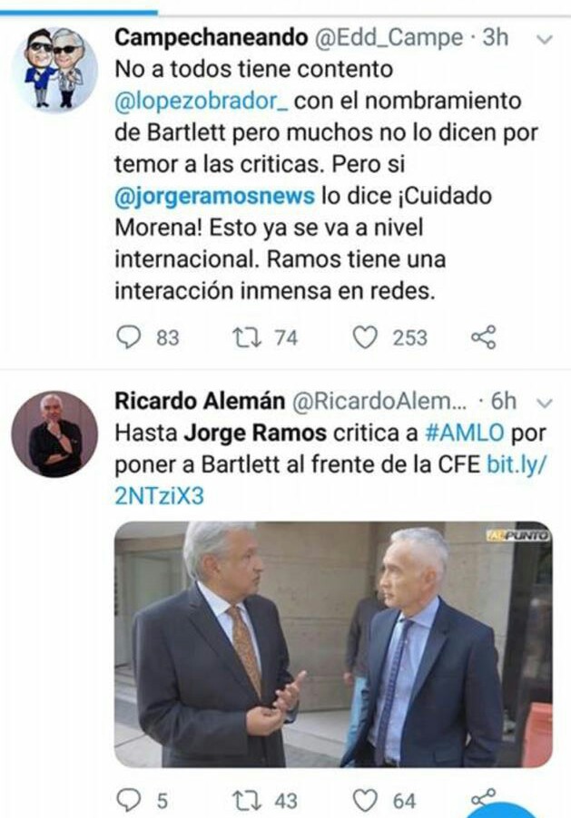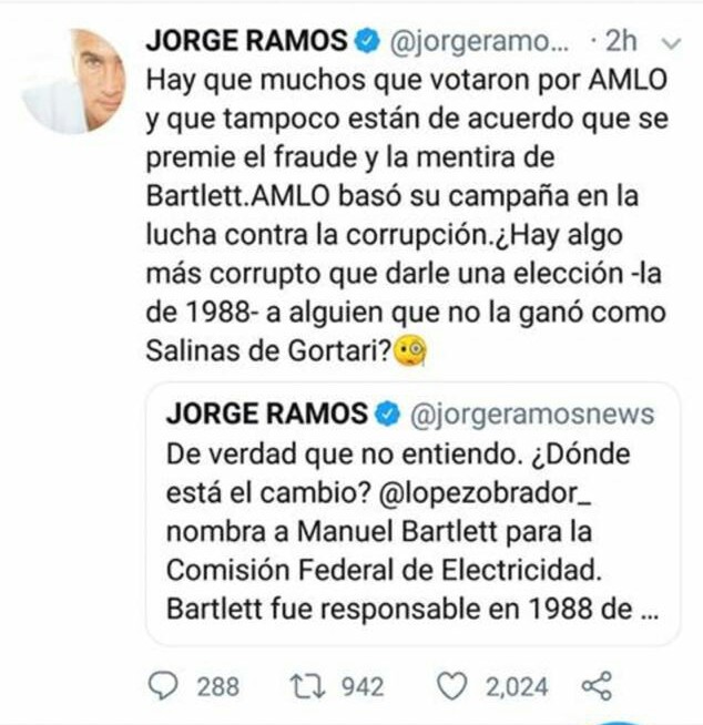 El periodista Jorge Ramos fue de los primeros en cuestionar la designación, recordando que Bartlett fue el responsable de lo que llama, el fraude electoral de 1998.