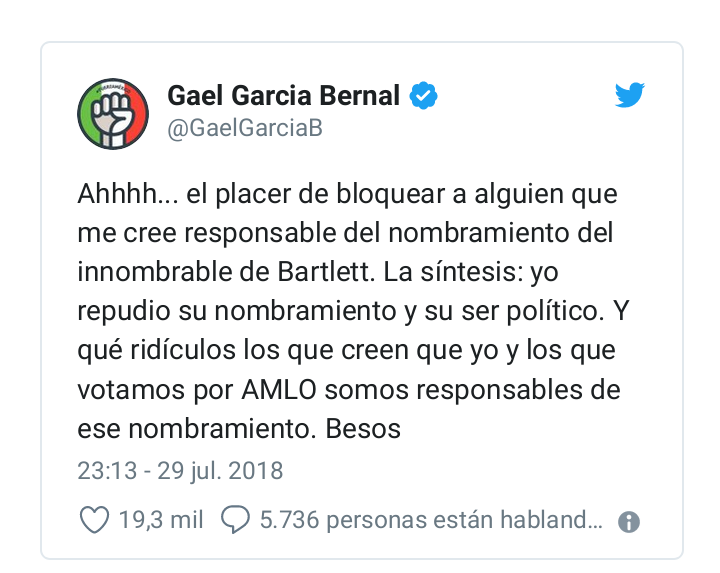 Ese fue el mensaje que escribió Gael García en su cuenta de Twitter, después de bloquear a un usuario que lo responsabilizó del nombramiento de Manuel Bartlett, dado que Gael fue uno de los grandes promotores del tabasqueño, durante la campaña presidencial.