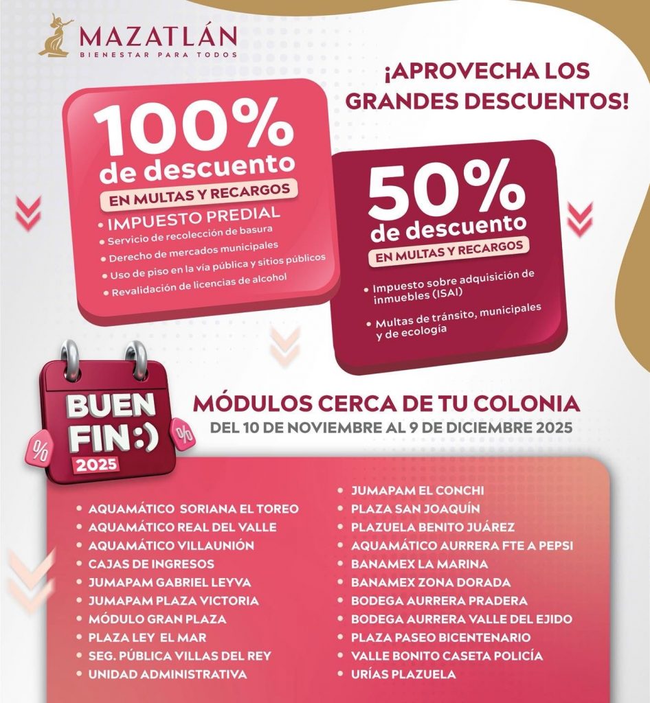 El Gobierno de Mazatlán, que encabeza la Presidenta Estrella Palacios Domínguez, informa que también continúa la campaña especial de descuentos del 50 por ciento en ISAI, multas de tránsito y de Ecología, la cual vence este 10 de diciembre Mazatlán, Sinaloa, 4 de diciembre de 2025.– El Gobierno de Mazatlán, a través de la Tesorería