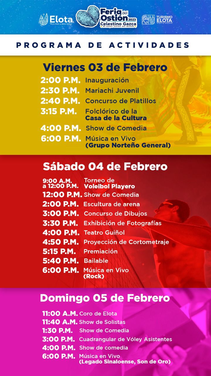 El domingo 05 de febrero, está programado el coro de Elota, show de cantantes solistas, cuadrangular de voleibol, show de comedia y música en vivo.