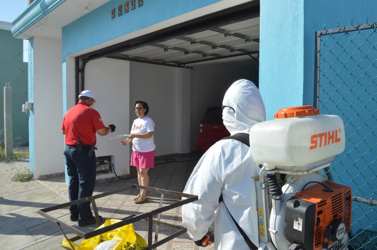 Las brigadas avanzaron casa por casa y calle por calle, luego del paso de las camionetas sanitizadoras que rociaron sustancias químicas. Los empleados municipales entregaron mil 200 kits, que contienen cubrebocas y recomendaciones, en el mismo número de hogares.