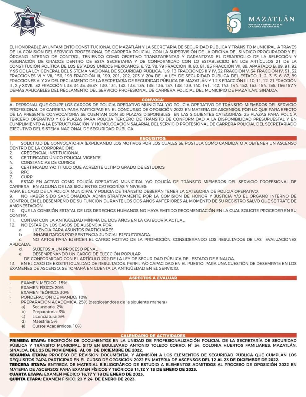 Mazatlán, Sinaloa 25 de Noviembre de 2022. — La Secretaria de Seguridad Pública y Tránsito Municipal a través de la Comisión del Servicio Profesional de Carrera Policíal, convocan a elementos en activo para postularse en las 30 plazas de Policía Tercero Operativo y Policía Tercero de Tránsito.