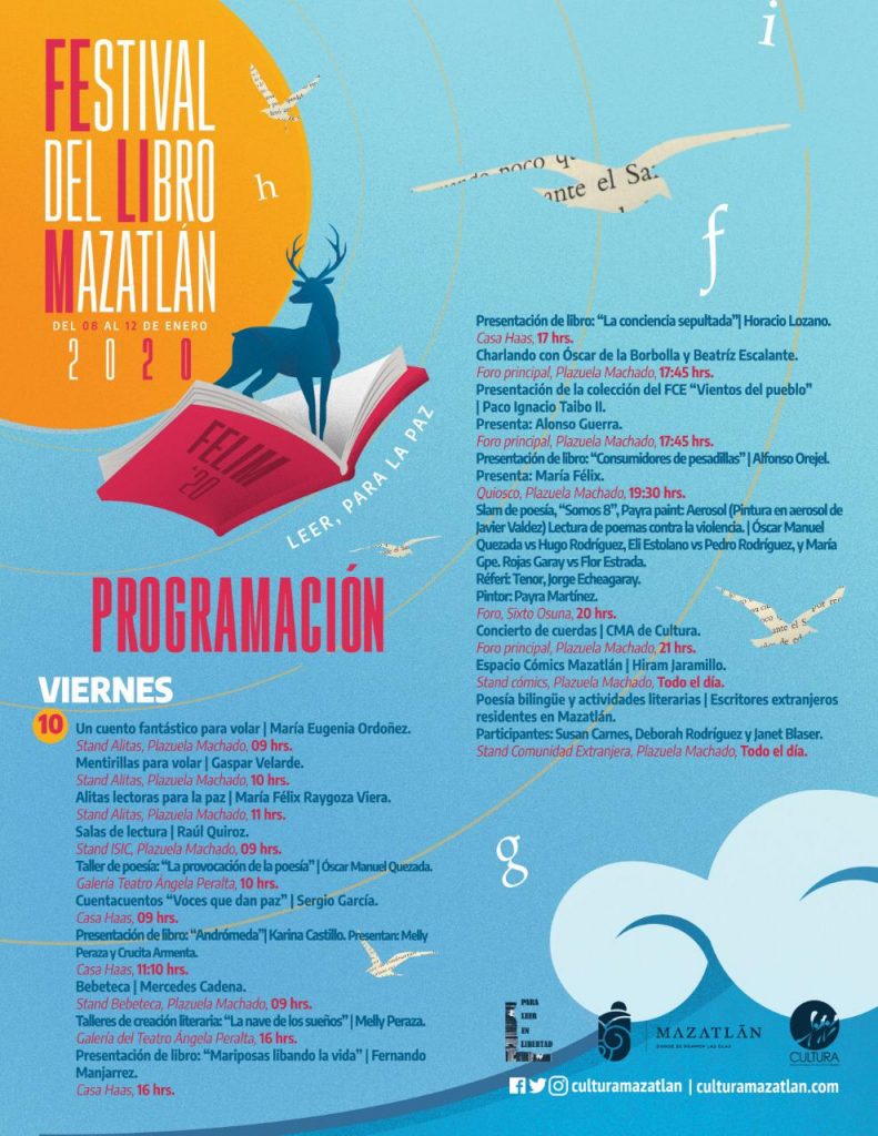 Mazatlán, Sinaloa.- El Festival de Libro Mazatlán vivirá este viernes un día muy intenso con las diferentes actividades programadas que van dirigidas para todo tipo de auditorio, con eventos gratuitos al aire libre, en recintos, presentación de libros, talleres literarios, para finalizar con un concierto musical en el Puerto.