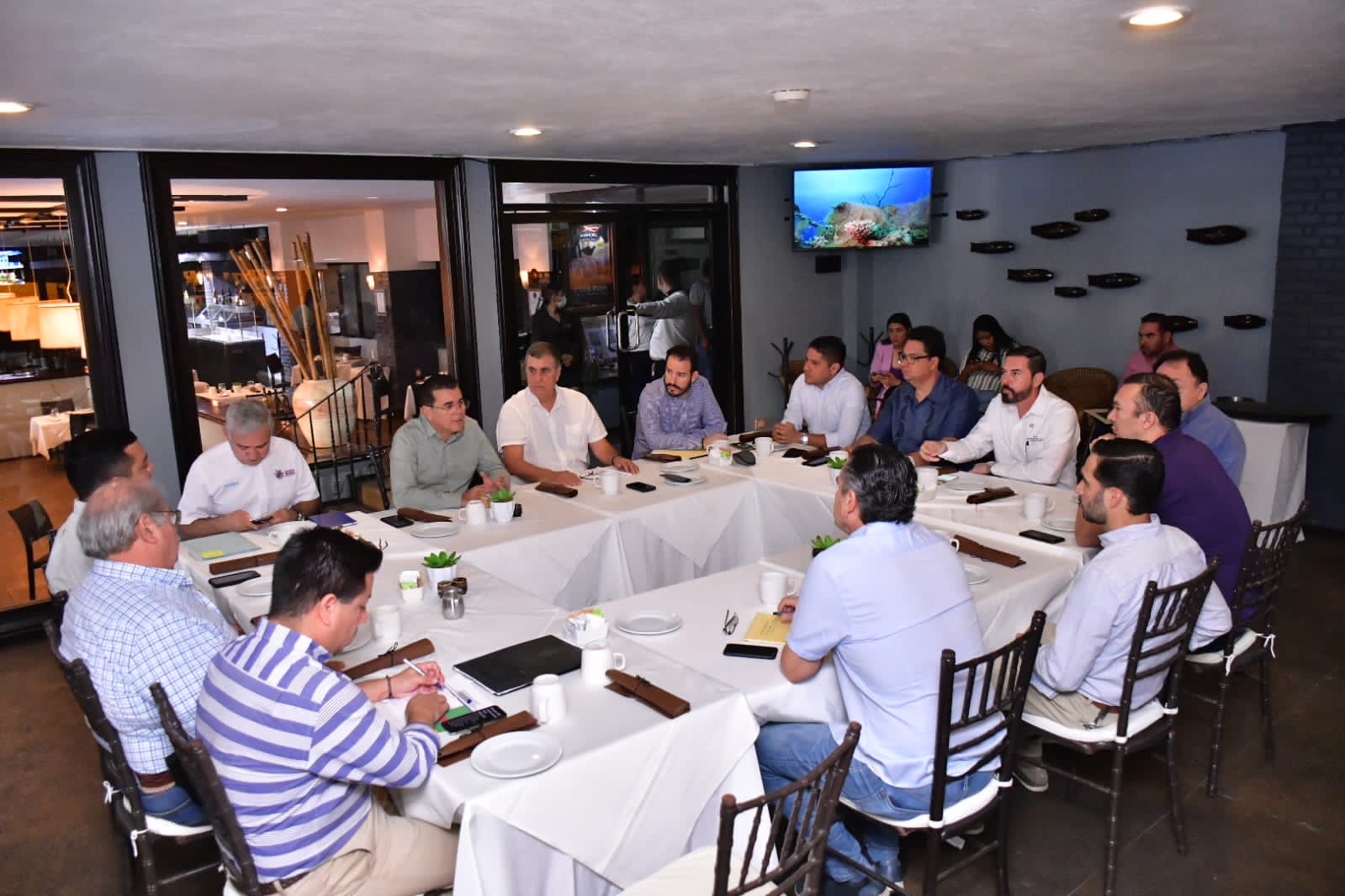 Mazatlán, Sinaloa, 08 de noviembre de 2022.- El presidente municipal de Mazatlán, Edgar González Zataráin, asistió a una reunión de trabajo con líderes de diferentes cámaras, entre ellos inmobiliarios, Coparmex, Cmic, Canaco, Codesin, transporte de carga y asociaciones de hoteles.