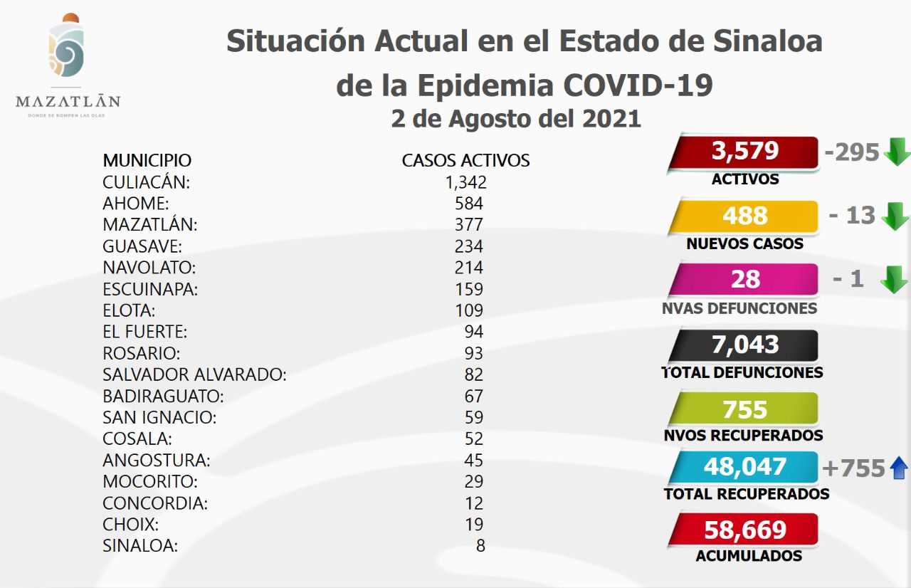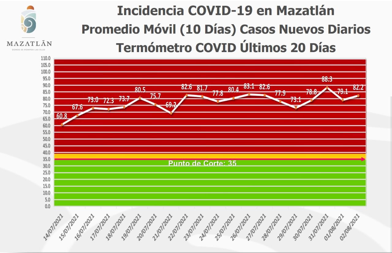 A nivel estatal, el puerto se mantiene en color rojo del Semáforo Epidemiológico Estatal y en la tercera posición en Sinaloa, superado sólo por los municipios de Culiacán y Ahome, que al día de hoy presentan mil 342 y 584 casos activos respectivamente.