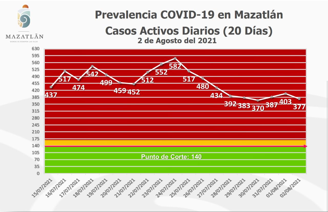 Mazatlán.- La noche del lunes la ciudad registró un leve descenso en los casos activos de Covid-19 y este martes amaneció con 377, sin embargo, el Gobierno Municipal mantiene su llamado a la población a no bajar la guardia en las medidas preventivas contra el virus Sars-Cov-2.