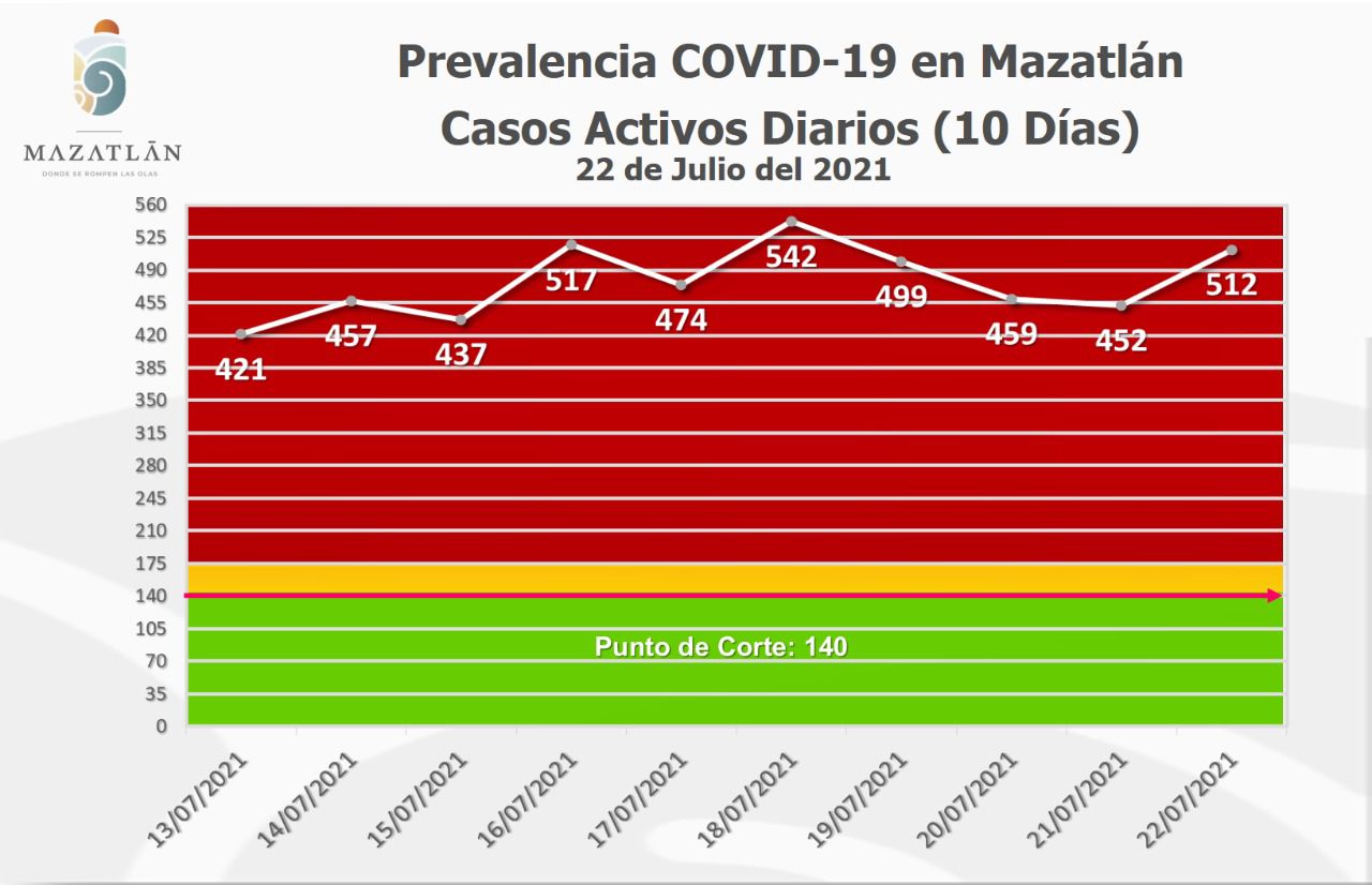 Mazatlán.- Este viernes la ciudad amaneció con 512 casos activos de Covid-19, por lo que el Gobierno Municipal mantiene sus acciones y exhorta a la población a continuar con las medidas preventivas para mitigar y contener los contagios con el virus Sars-Cov-2.