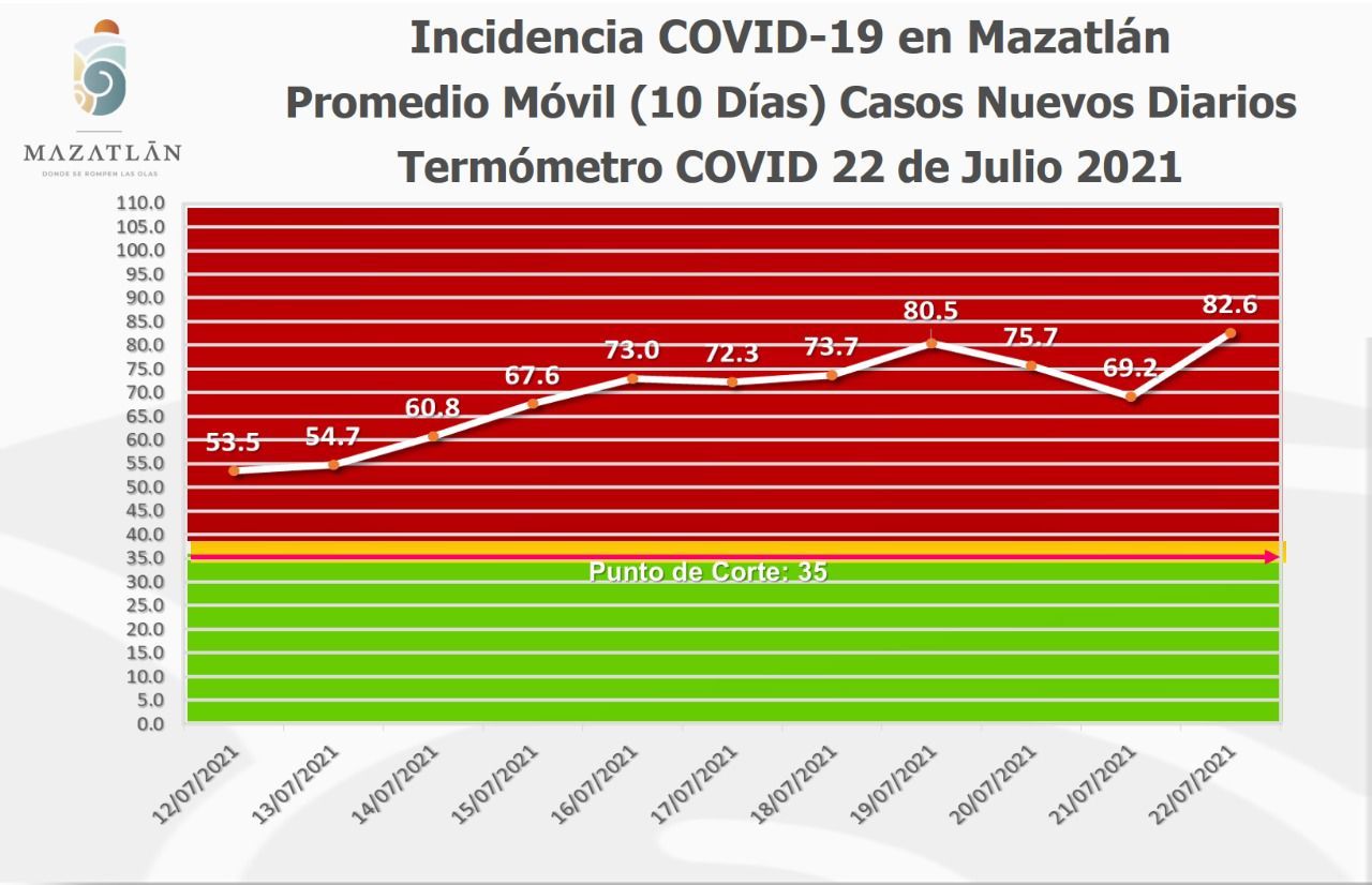 Castillo López mencionó que el Termómetro Covid, sistema que emplea el Ayuntamiento para observar los nuevos casos de esta enfermedad, se ubicó hoy en los 82.6 grados y está en color rojo.