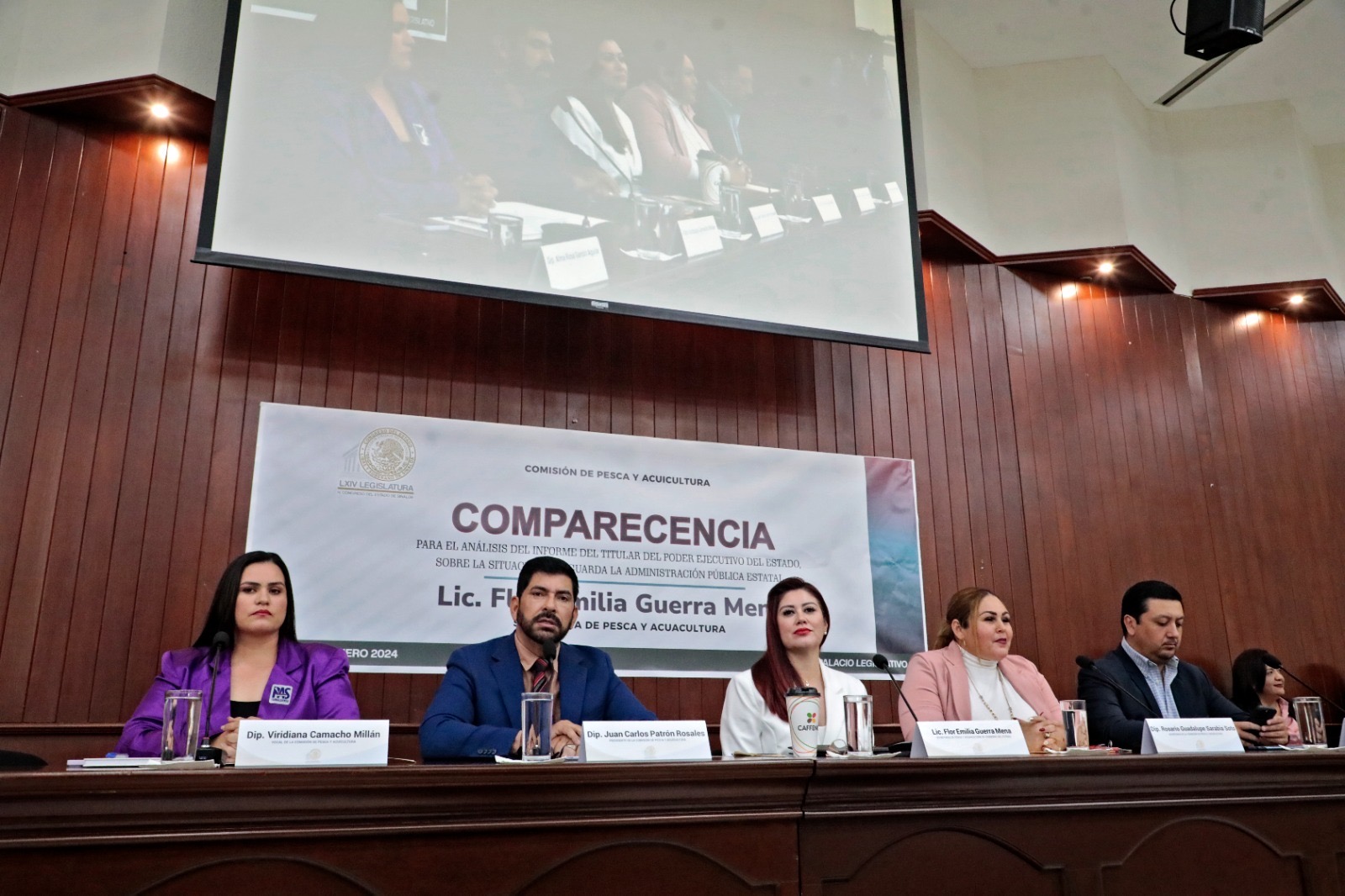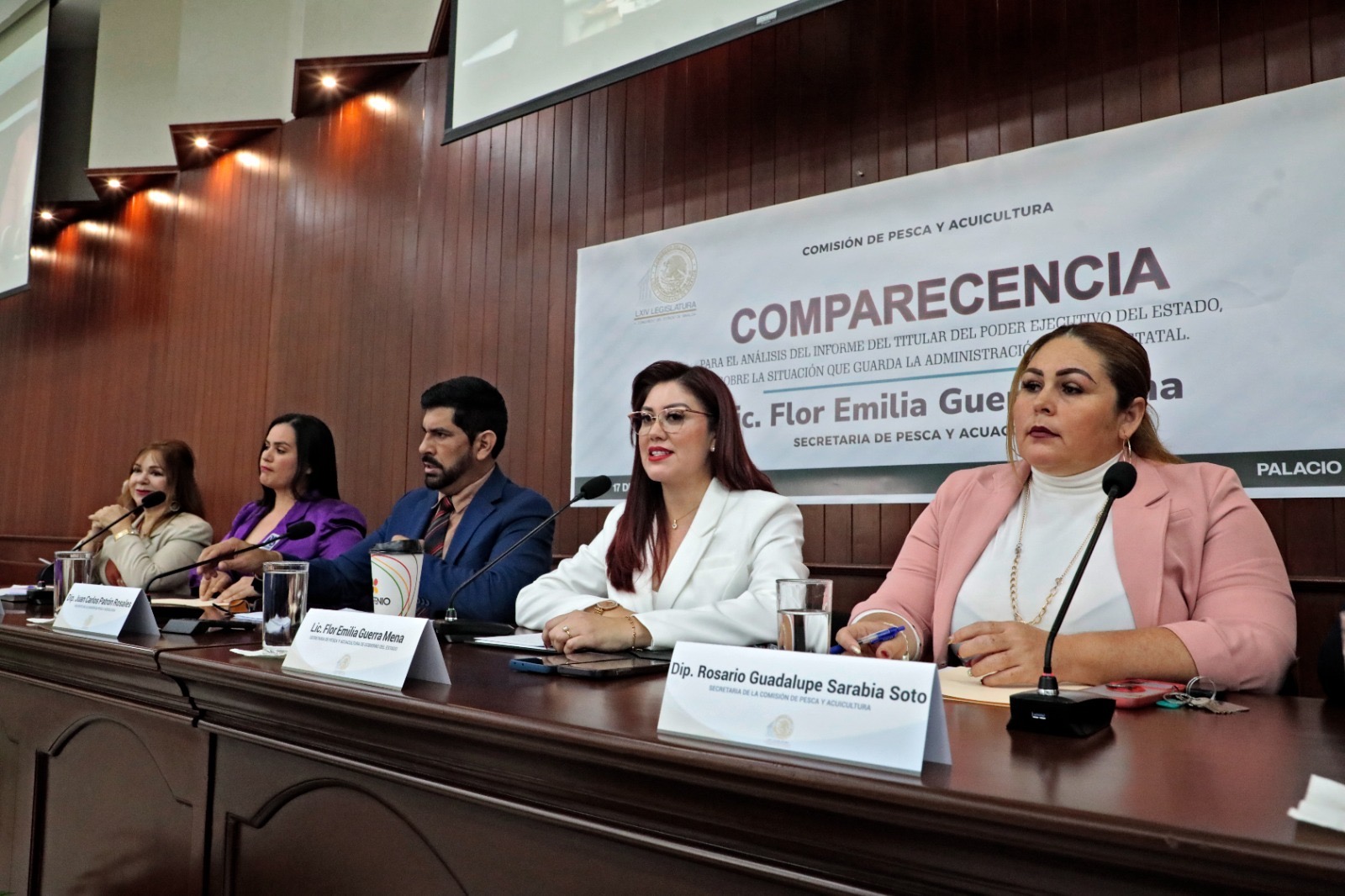 Culiacán, Sinaloa, 17 de enero del 2024.- La secretaria de Pesca y Acuacultura Flor Emilia Guerra Mena, compareció ante las y los legisladores del Congreso del Estado de Sinaloa, lugar en el que dio a conocer todas las acciones referentes al sector pesquero y acuícola durante el segundo año de la administración del gobernador Rubén Rocha Moya.