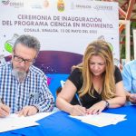 Cosalá, Sinaloa, 16 de mayo de 2022. Las niñas y los niños de este municipio de la sierra sinaloense hicieron un divertido contacto con el conocimiento científico al disfrutar del programa Ciencia en Movimiento, inaugurado la tarde del domingo por la presidenta municipal de Cosalá, Carla Úrsula Corrales Corrales, y el director general de CONFÍE, Dr. Carlos Karam Quiñones.