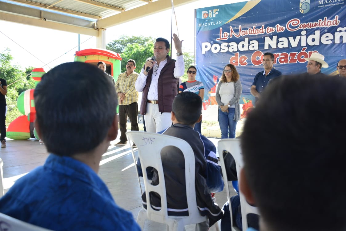 Funcionarios municipales, encabezados por el Secretario del Ayuntamiento, José de Jesús Flores Segura y el Director del Sistema DIF, Roberto Rodríguez Lizárraga, acudieron a ese poblado para llevar de manera simultánea las acciones de rehabilitación y una Posada Navideña de Corazón, como parte de la atención que el Gobierno de Mazatlán, que encabeza el Químico Benitez Torres, brinda a los habitantes de la zona rural del Municipio.