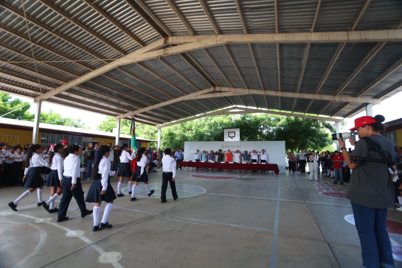 En la ceremonia, se llevaron a cabo honores a la bandera y se entonó el Himno Nacional. Además, Estrella Palacios entregó una bandera con su asta, material deportivo, diplomas a estudiantes, y llevó a cabo la plantación de un árbol como símbolo de vida, mientras que el alumno Mateo entregó un ramo de flores a la Presidenta de Mazatlán en agradecimiento