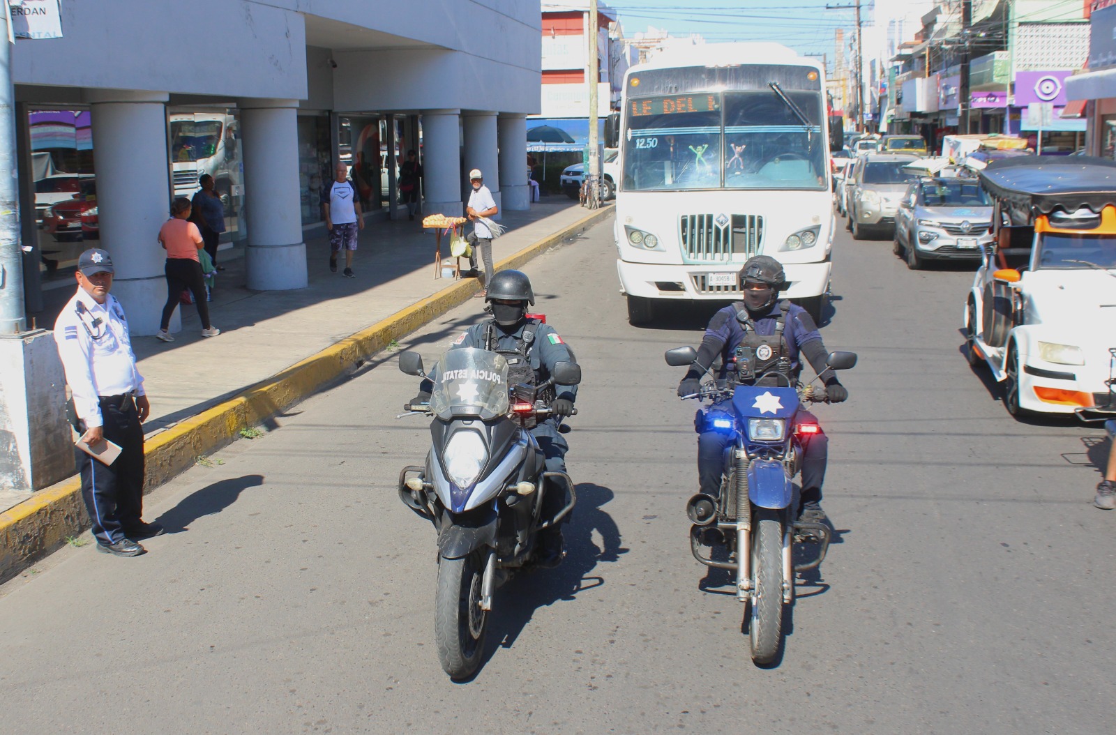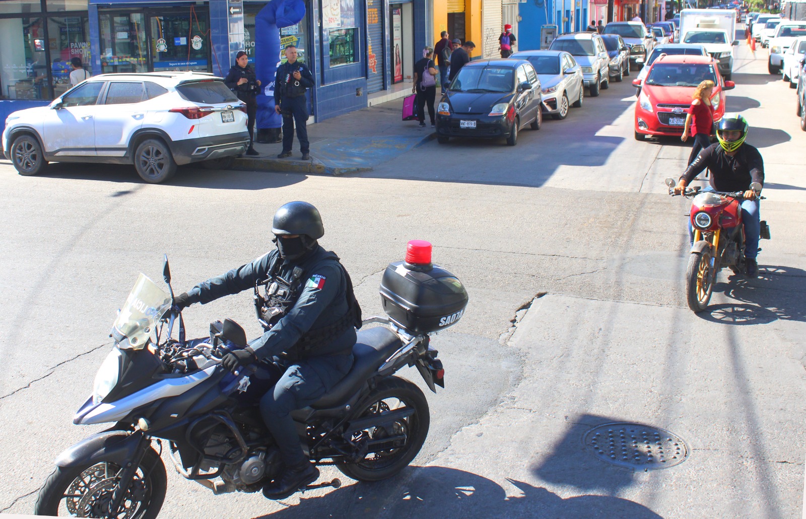 Elementos de la Secretaría de Seguridad Pública Municipal con binomios a pie y motocicleta y en patrullas conforman la estrategia preventiva durante las festividades.