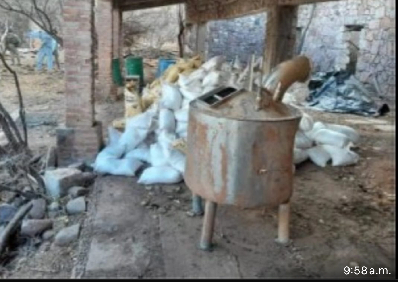 Durante acciones de reconocimiento terrestre en dichos municipios, el personal militar localizó asentamientos utilizados para la fabricación de drogas sintéticas, con diversas sustancias químicas, además de bidones, tambos y tinas.