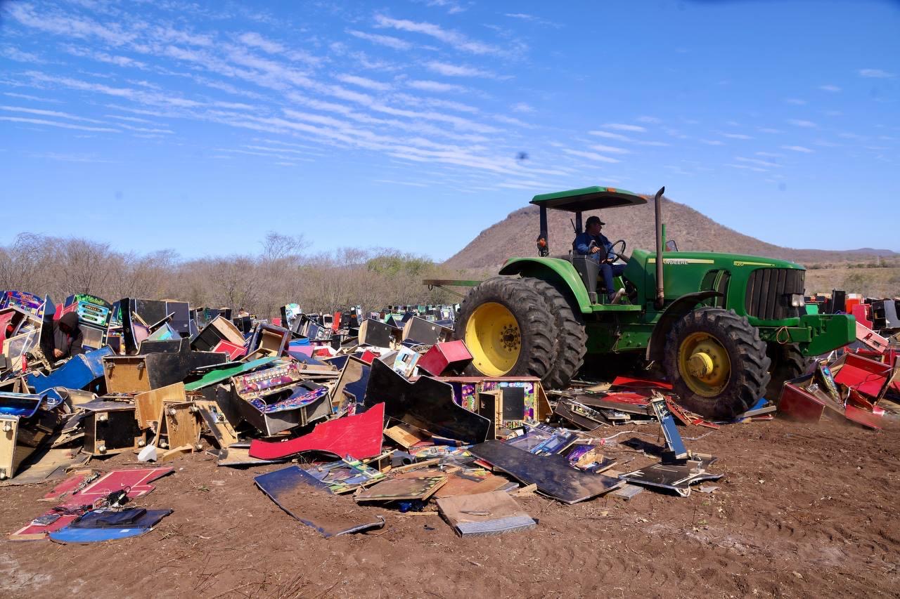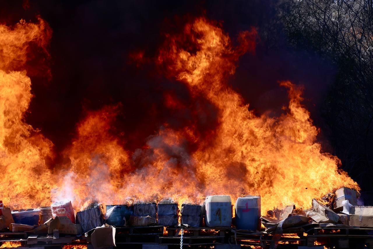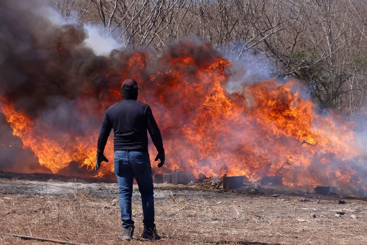 Culiacán, Sinaloa, a 30 de enero de 2025.- Artefactos utilizados por la delincuencia que fueron decomisados en operativos conjuntos con las fuerzas federales en los municipios de Culiacán, Navolato y Mazatlán, así como diversos tipos de drogas, fueron incinerados hoy ante la presencia del gobernador Rubén Rocha Moya, en donde también se destruyeron objetos diversos como máquinas tragamonedas, chalecos tácticos, placas balísticas y drones, entre otros artefactos decomisados a la delincuencia.