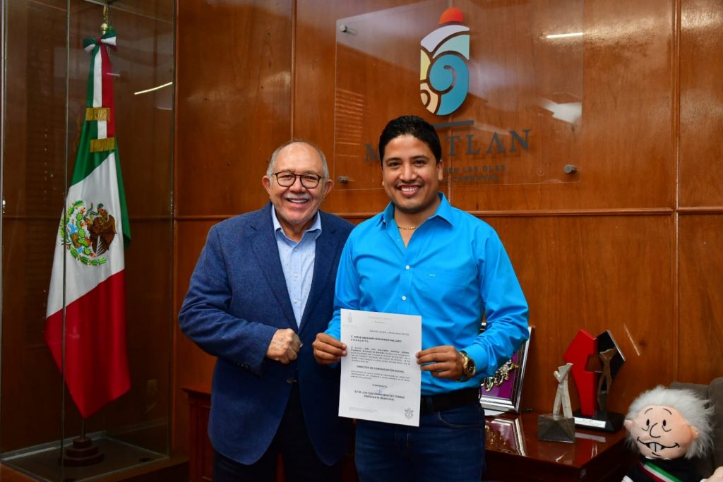 Mazatlán.- El Alcalde Luis Guillermo Benitez Torres recibió la tarde de este martes al licenciado Jorge Abraham Hernández Salgado y le tomó la protesta de ley como nuevo Director General de Comunicación Social del Gobierno Municipal.
