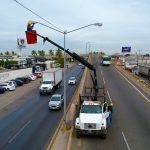 Tres cuadrillas del departamento de alumbrado público, con apoyo de dos grúas y una camioneta por tierra realiza la rehabilitación de las lámparas instaladas a lo largo de carretera internacional y libramiento Luis Donaldo Colosio desde el Castillo hasta el Venadillo, incluyendo los tres pasos superiores vehiculares de ese tramo.