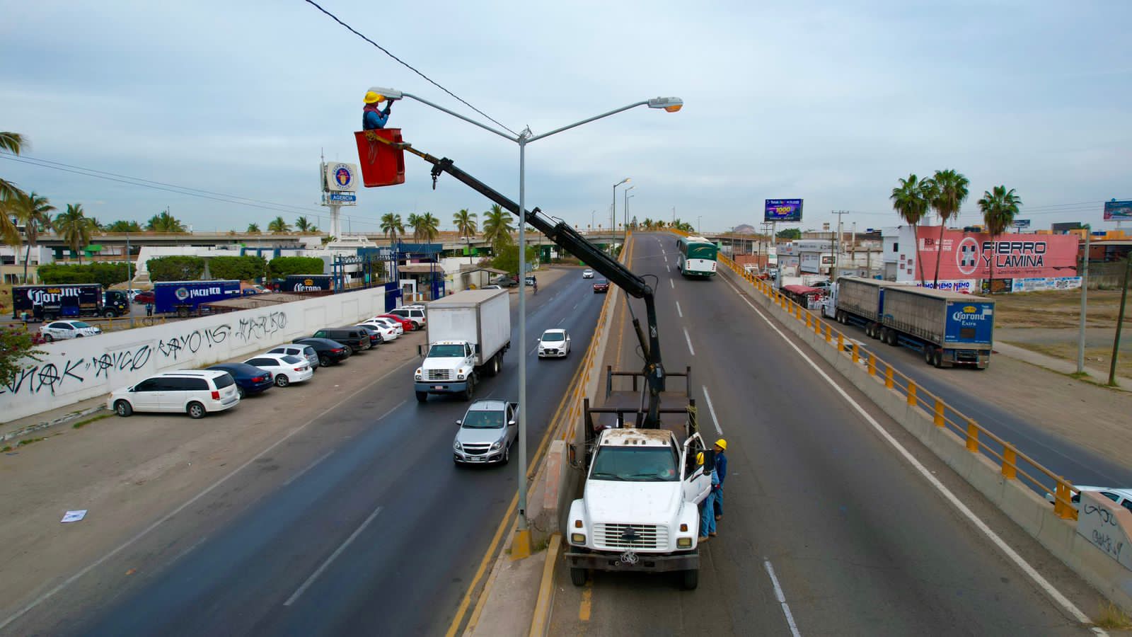 Tres cuadrillas del departamento de alumbrado público, con apoyo de dos grúas y una camioneta por tierra realiza la rehabilitación de las lámparas instaladas a lo largo de carretera internacional y libramiento Luis Donaldo Colosio desde el Castillo hasta el Venadillo, incluyendo los tres pasos superiores vehiculares de ese tramo.