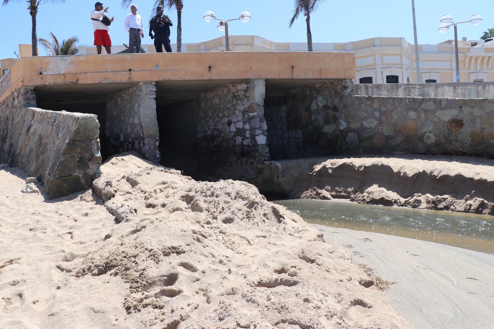 Se trata de un dren subterráneo que capta aguas pluviales del Viejo Mazatlán y corre a lo largo de la Calle Roosevelt, desde la Calle Aquiles Serdán hasta llegar a Olas Altas, y es en su punto de salida donde se saturó de la arena arrastrada por la marea, bloqueando el flujo normal del agua.