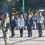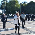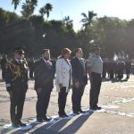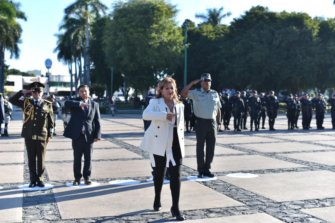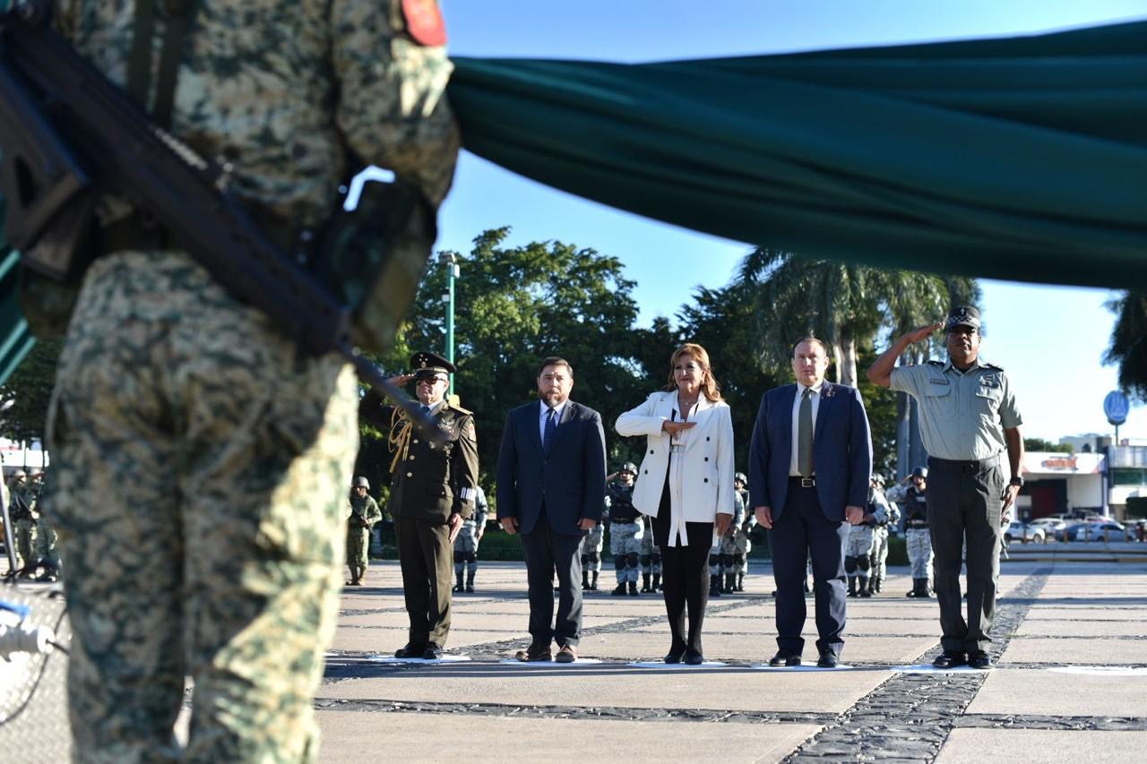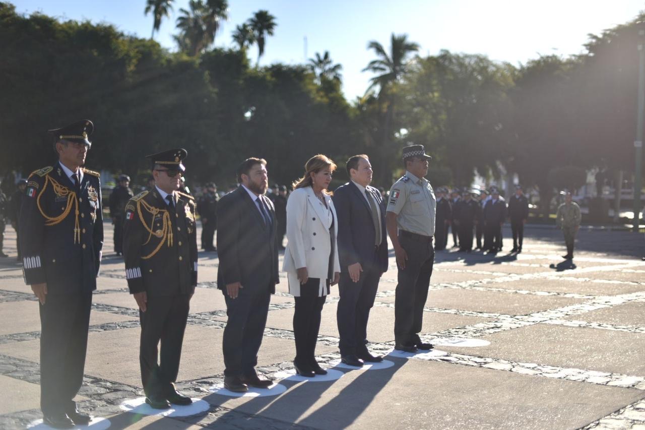 Culiacán, Sinaloa 19 de febrero de 2024. Con el fin de conmemorar el 111 aniversario del Ejército Mexicano, en representación del gobernador de Sinaloa, el Dr. Rubén Rocha Moya, acudió la Dra. María Teresa Guerra Ochoa en compañía de autoridades civiles y militares quienes llevaron a cabo la ceremonia de izamiento de bandera a toda asta con Honores de Ordenanza en la plaza cívica de Palacio de Gobierno.