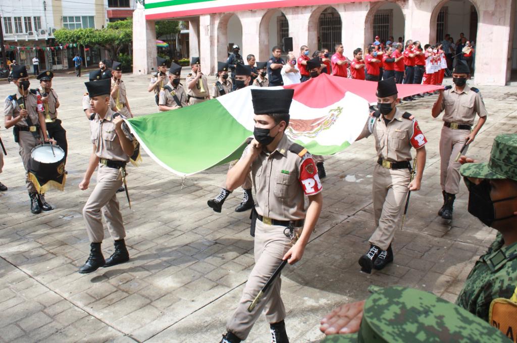La escolta y banda de guerra del Colegio Militarizado Nuevo México fueron los encargados de encabezar los honores a la enseña nacional.