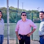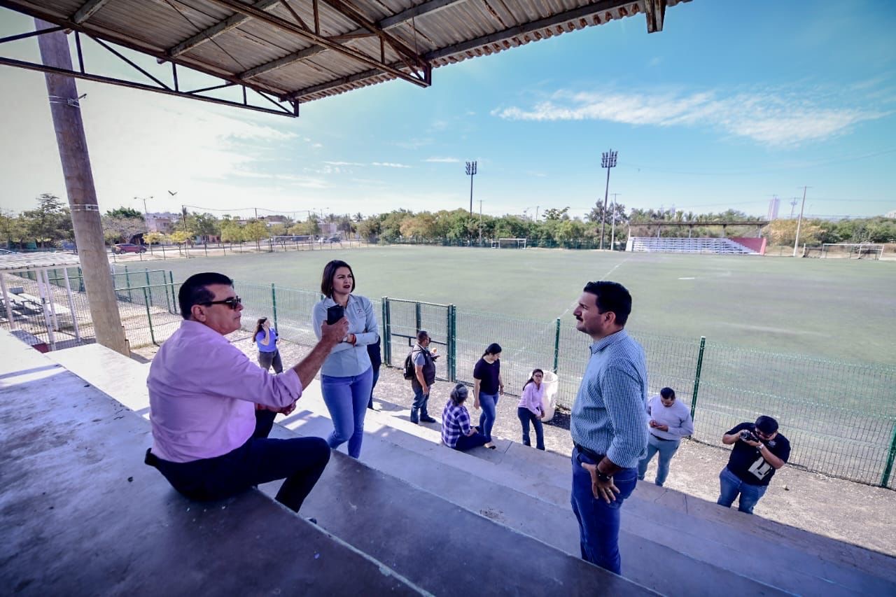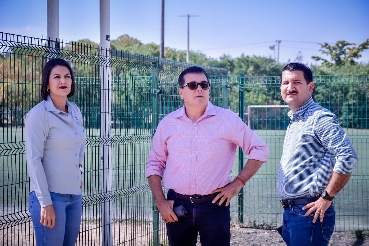 El Alcalde Edgar González junto a la directora del Imdem, Fabiola Verde, y el director de Obras Públicas, Rigoberto Arámburo, realiza un recorrido de supervisión en las labores realizadas en el campo 1 de futbol.