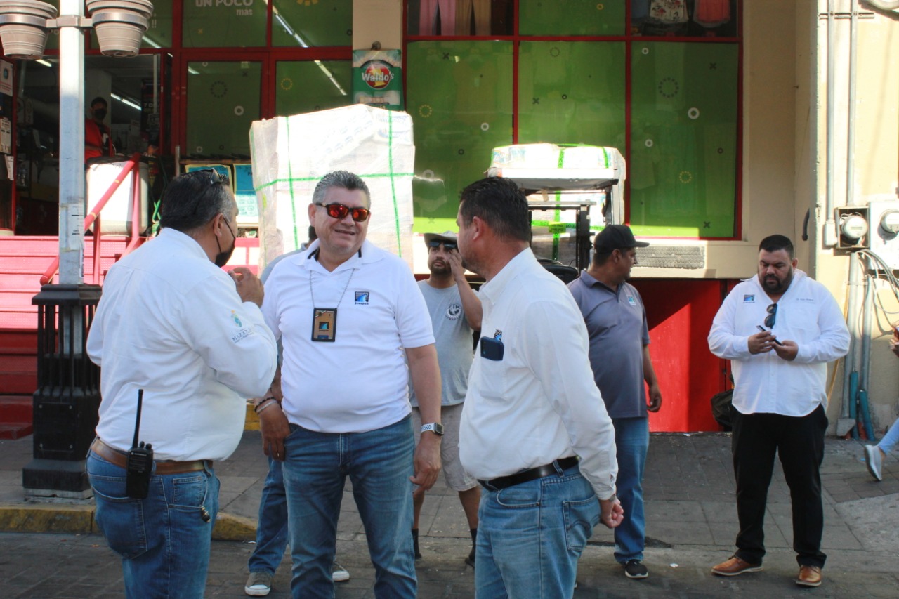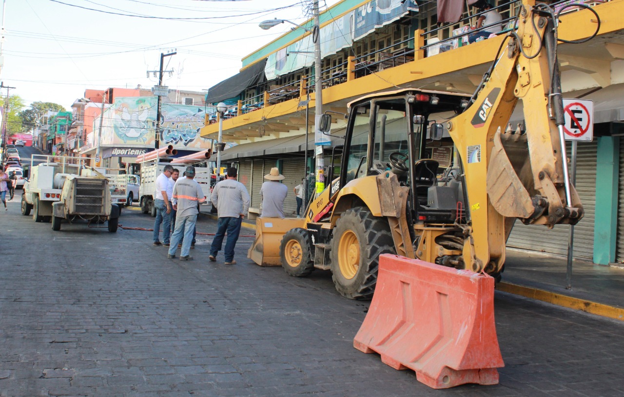 MAZATLÁN._ A temprana hora de este miércoles 26 de mayo, personal del Distrito Central de la Gerencia de Operaciones de Jumapam, inició los trabajos para el desfogue de línea del colector del Mercado Municipal José María Pino Suárez, ubicado sobre la calle Benito Juárez, como parte de los trabajos para abatir la problemática del sistema de drenaje que padece el popular centro de abastos.