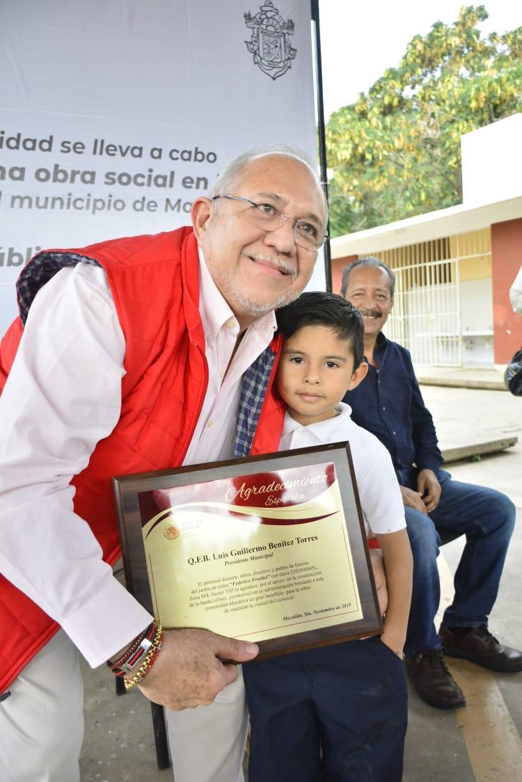 Al inaugurar la obra número 36, de lo que va de este 2020, que fue la barda perimetral construida en el jardín de niños Francisco Froebel, ubicado en la Colonia Urías, en lo que se invirtieron 335 mil 330.62, de recursos directos, el alcalde mazatleco indicó que esta obra es un pago a la deuda que dejaron los gobiernos anteriores con la ciudadanía mazatleca, y es parte de la justicia social que la Cuarta Transformación lleva a cabo a través de su Administración.