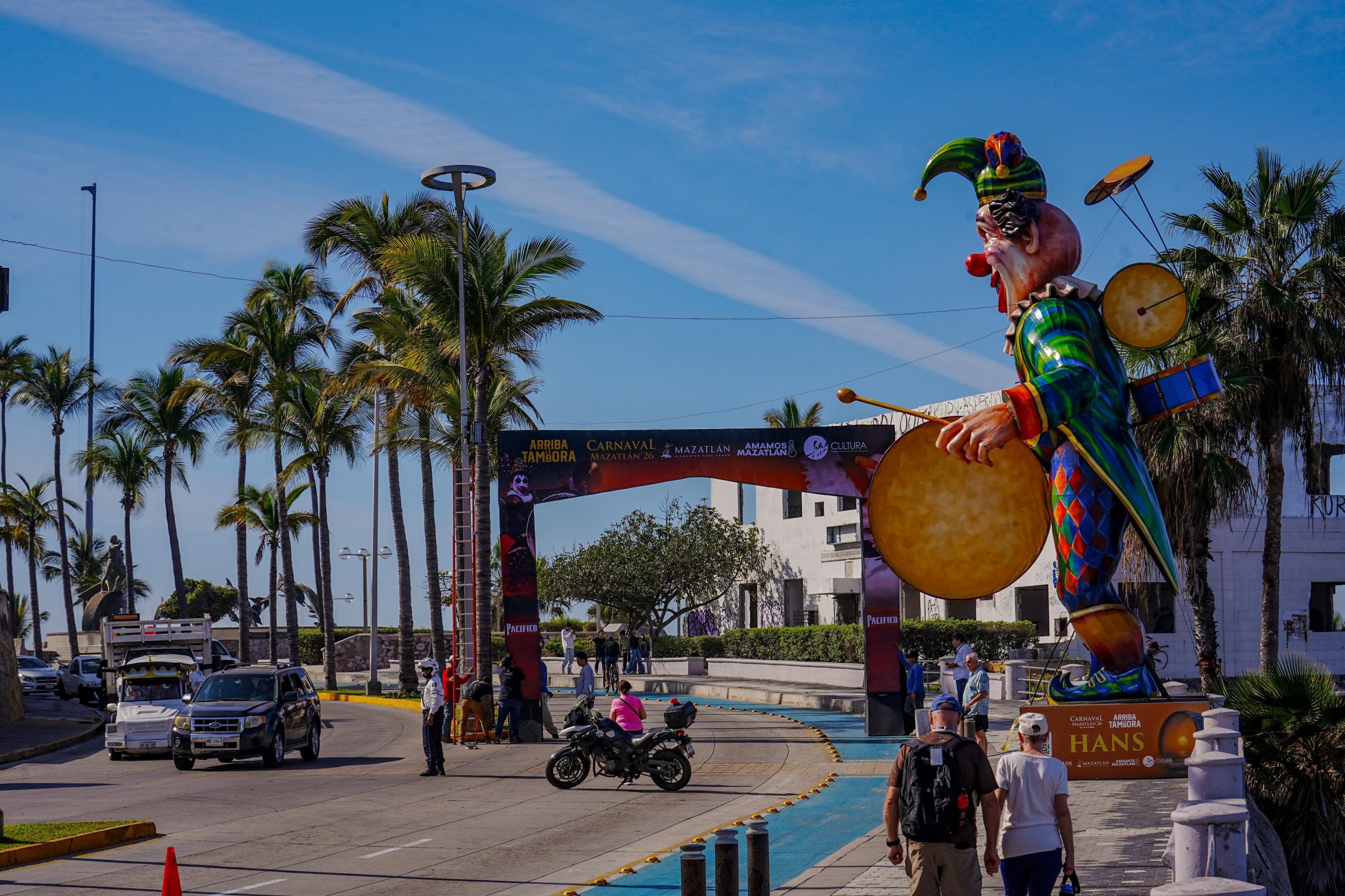 Mazatlán, Sinaloa, 4 de febrero 2026.- Como parte de los trabajos logísticos previos al Carnaval Internacional Mazatlán 2026 ¡Arriba la Tambora!, a tempranas horas de este día se llevó a cabo la colocación de arcos en accesos estratégicos de las zonas carnavaleras, acción fundamental para el ordenamiento y control de la movilidad durante las festividades.