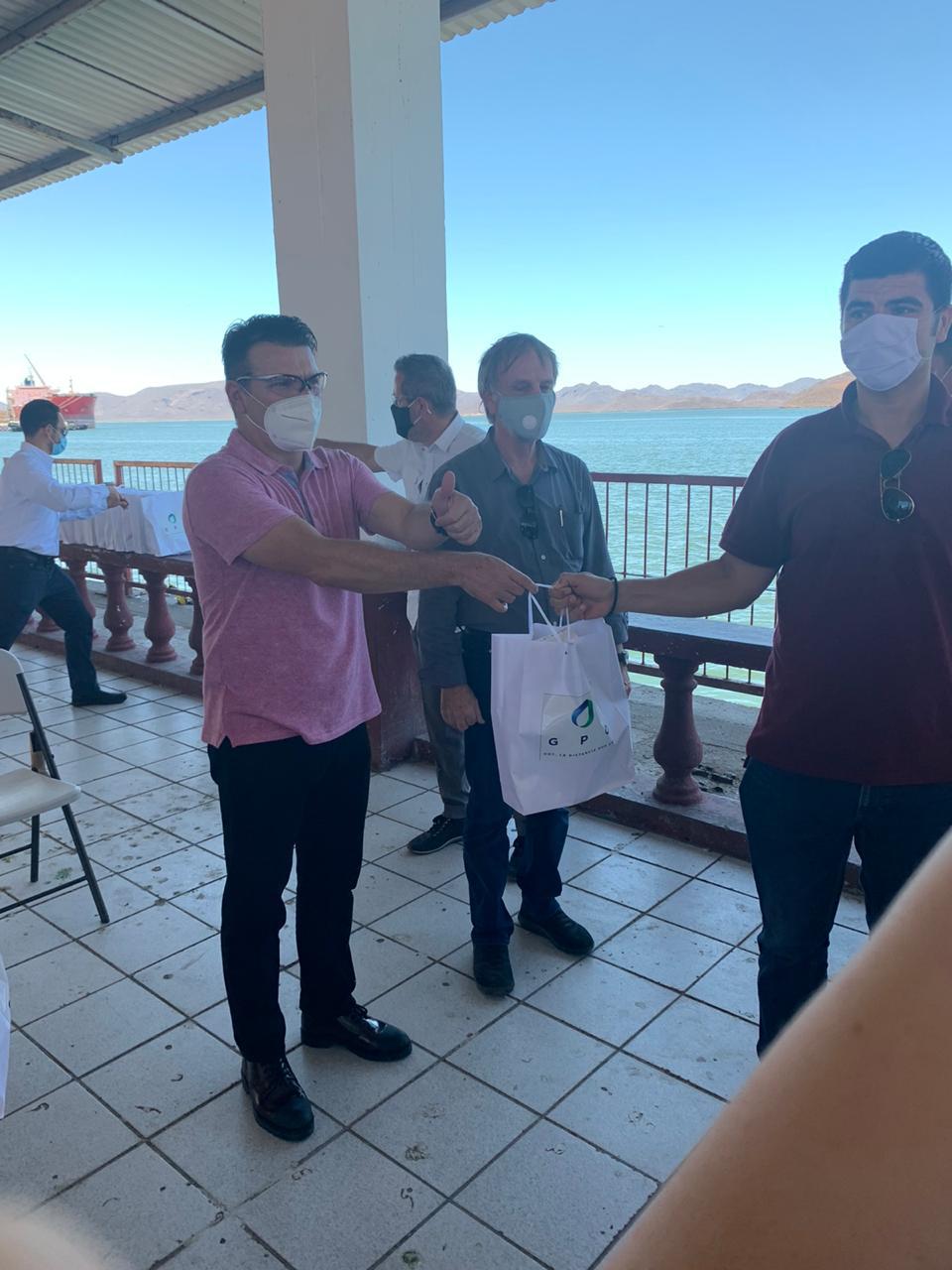 Pérez Barros también estuvo en el Centro cultural de Topolobampo, acompañado de la síndica del puerto, Deborah Preciado, y Lupita Audelo por parte de turismo/Sedeco Ahome, además del Ing. Jean Claude Hecht, Director de PROMAN México; Héctor Orrantia Coppel, Subsecretario de Promoción y Competitividad Económica de Sinaloa y representantes de las 8 estaciones de Cooperativas de Prestadores de Servicios Turísticos, para la entrega de Kits de Protección Personal Covid – 19.