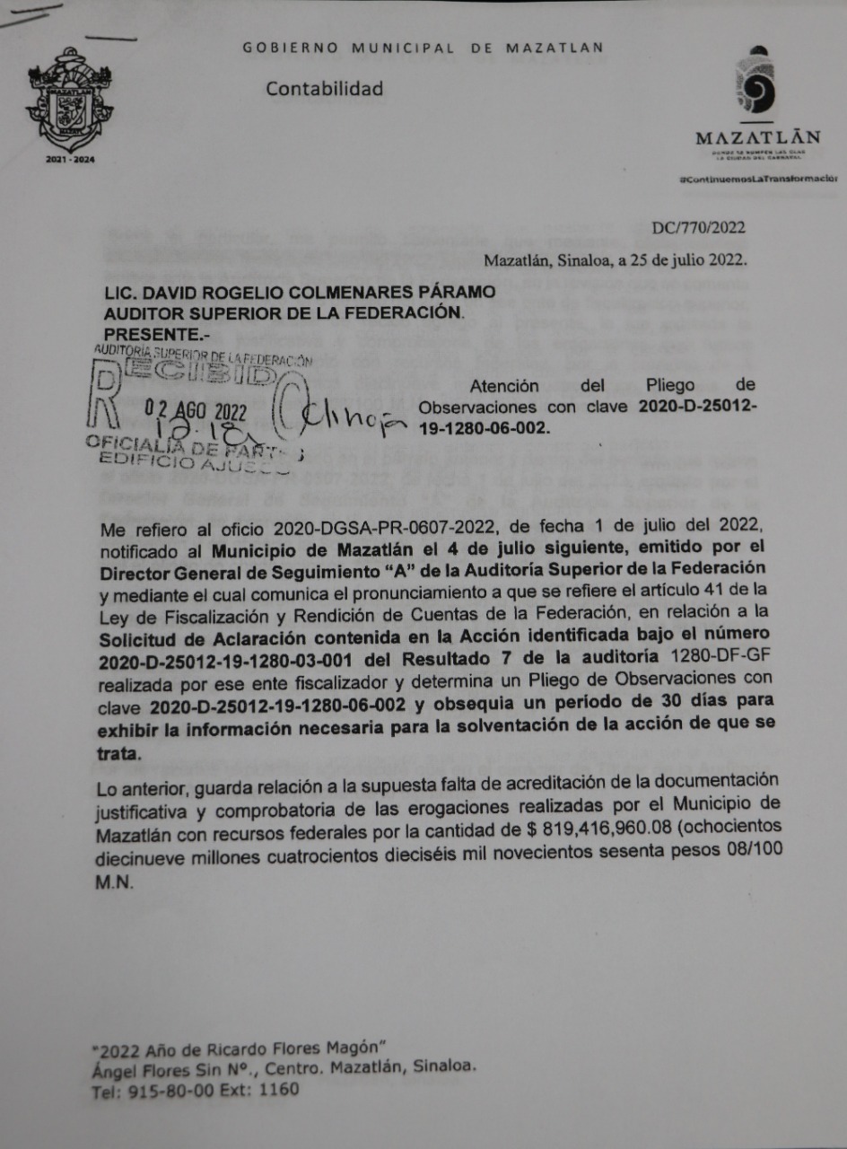 Alarcón Lizárraga agregó que es extraño que las autoridades de la Auditoría Superior de la Federación, aun cuando no han notificado al Ayuntamiento de Mazatlán, estén proporcionando información a través de otras vías.