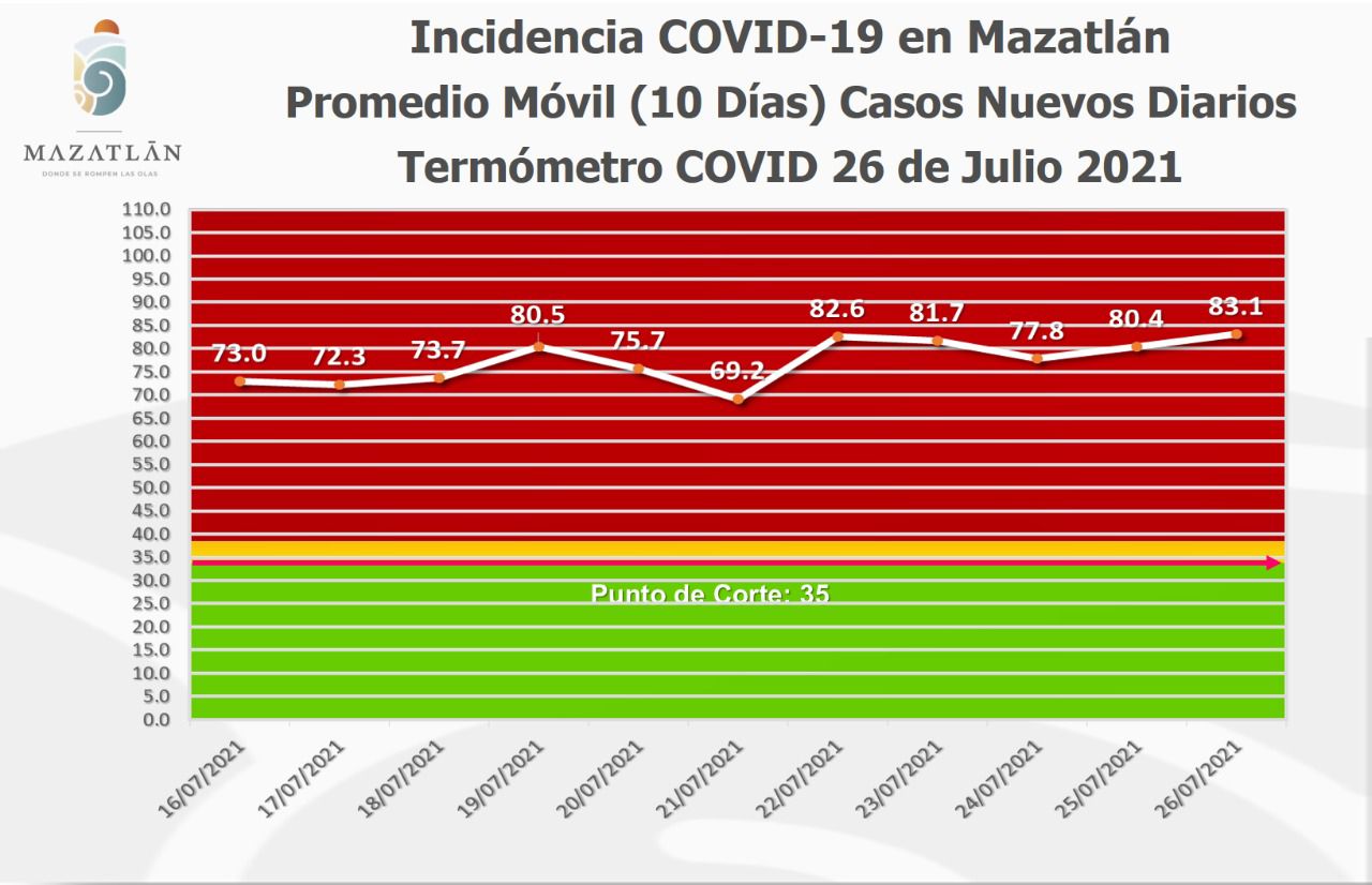 Mencionó que el Termómetro Covid del Municipio se ubicó este día en 83.1 grados y continúa en color rojo.