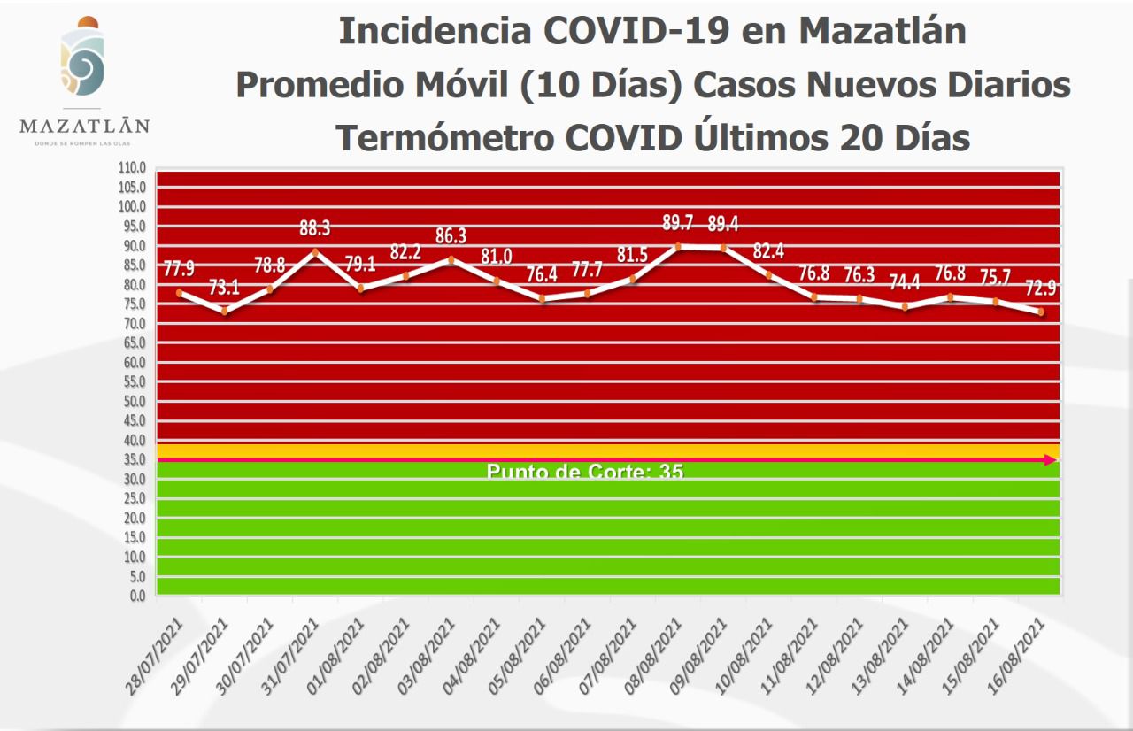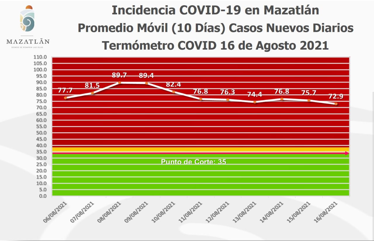 Mencionó que el Termómetro Covid, parámetro utilizado por el Ayuntamiento para observar los nuevos casos, presentó un descenso y se ubicó en 72.9 grados, sin embargo, continúa en color rojo.