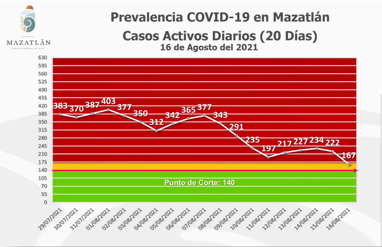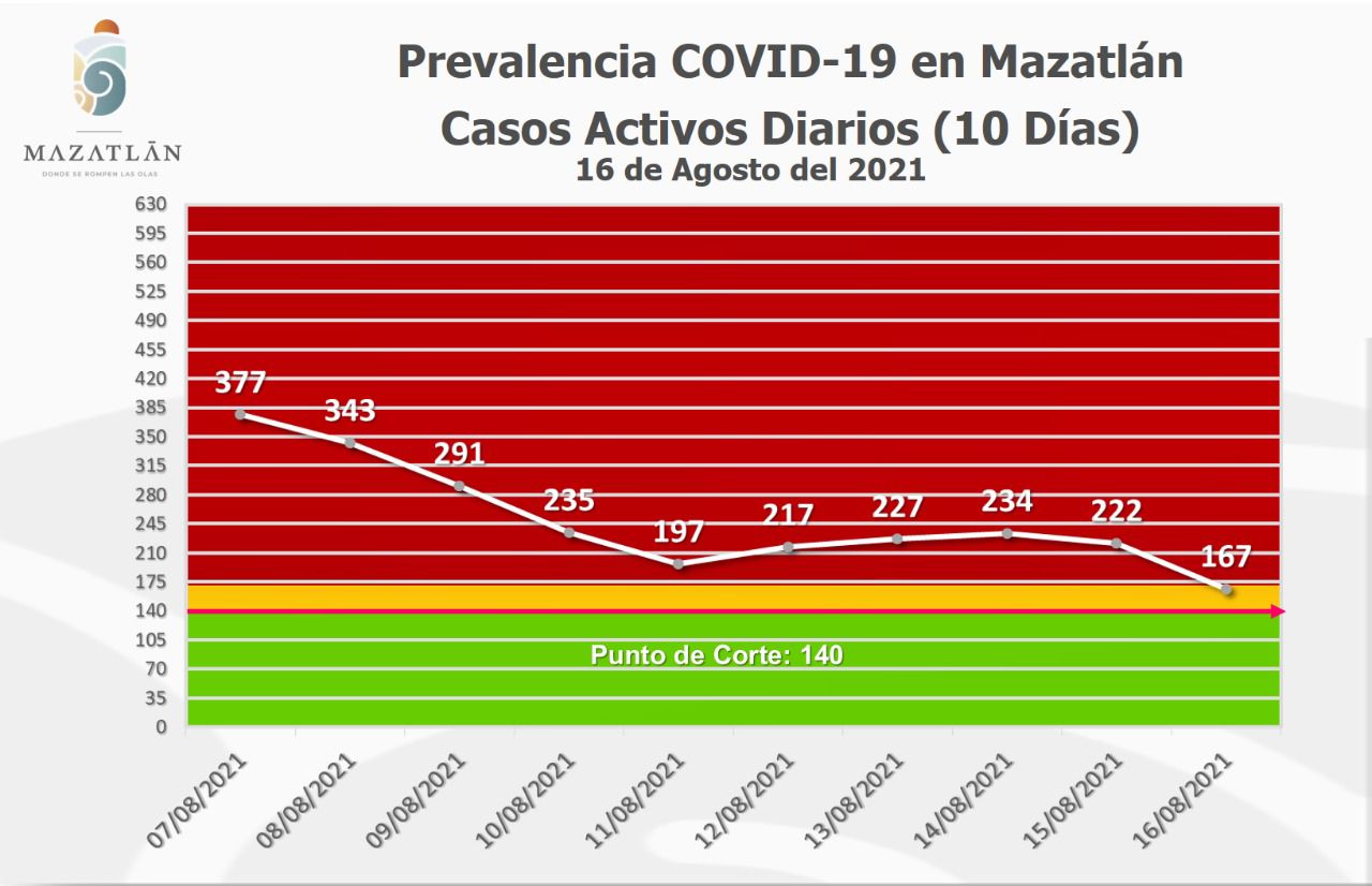 Mazatlán.- Este martes la ciudad amaneció con 167 casos activos de Covid-19 y éste es el segundo día a la baja en pacientes con el virus Sars-Cov-2, aseguró Cristian Castillo López, encargado de Protocolos y Sanidad del Gobierno Municipal.