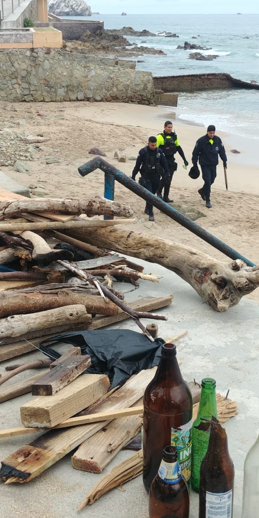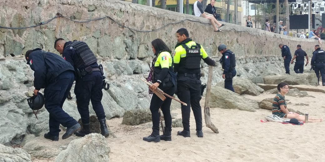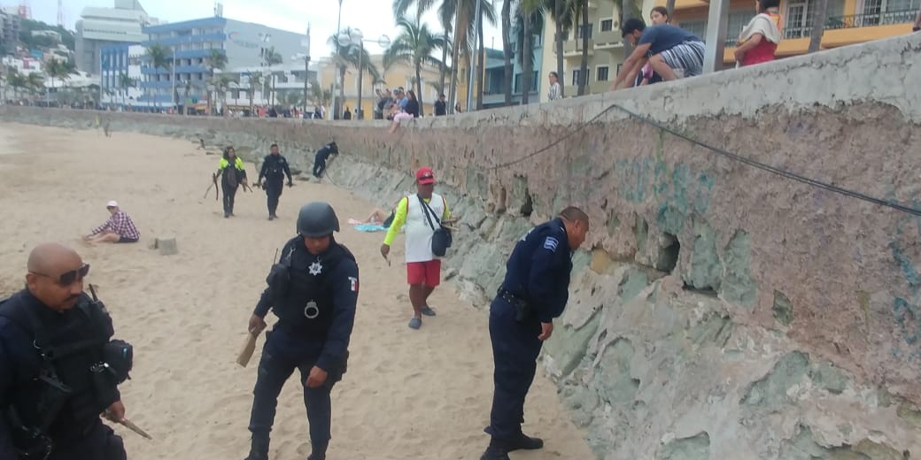 Elementos de la SSPYTM retiran palos, varillas y vidrios de la zona de playa.