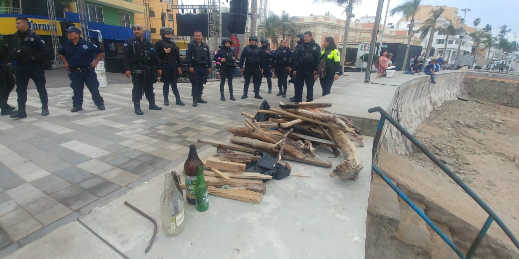 Más de una treintena de palos, botellas de vidrio y algunas varillas fueron retirados del lugar, y posteriormente los agentes fueron distribuidos sobre el paseo Olas Altas, en donde a partir de las nueve de la noche se llevará a cabo la celebración de fin de año.