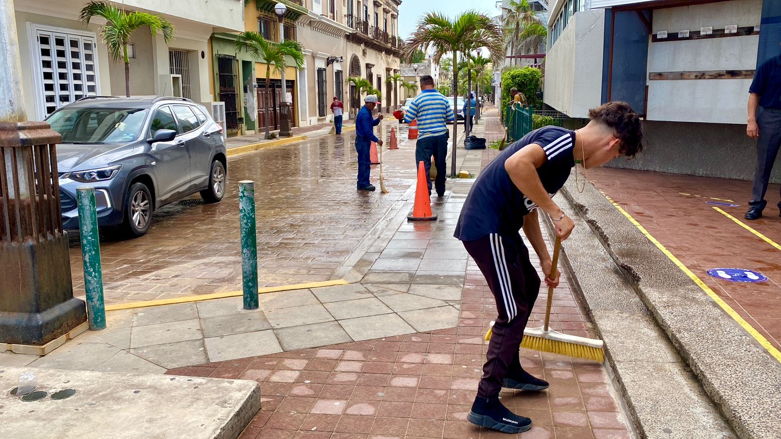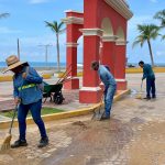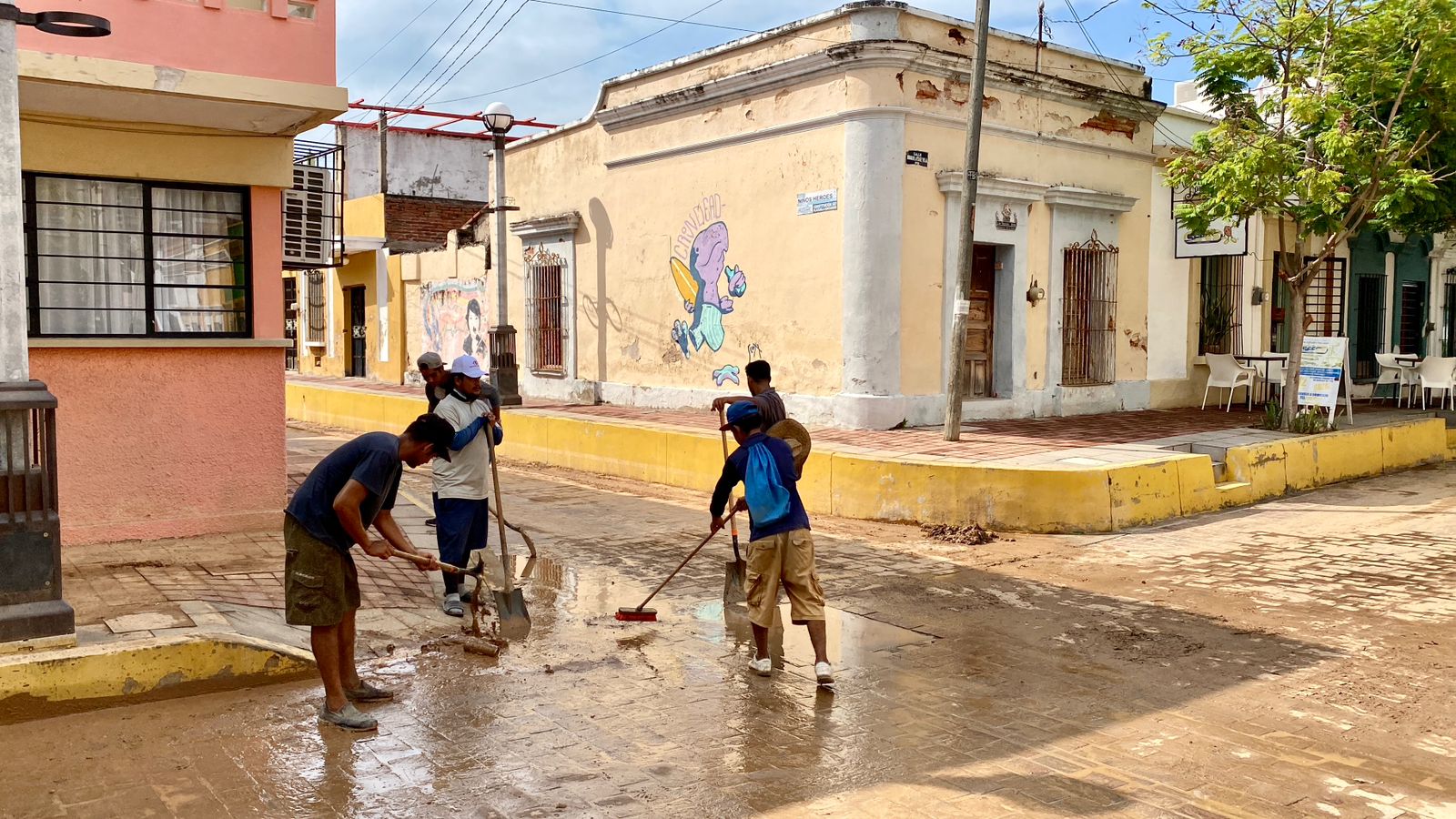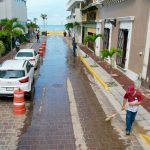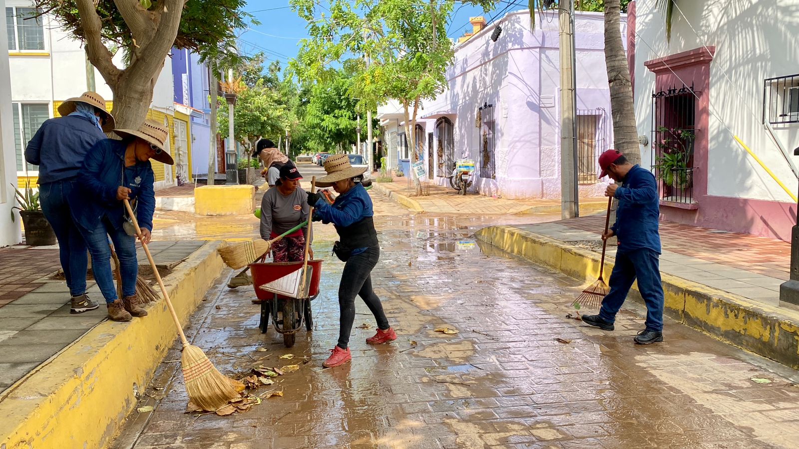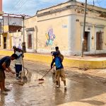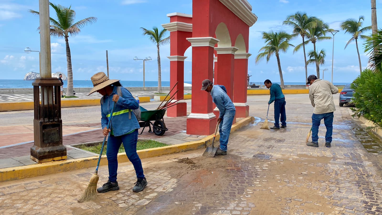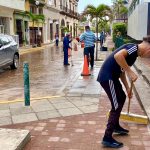 Mazatlán, Sinaloa, 12 de septiembre de 2023.- Cuadrillas de la Dirección de Servicios Públicos llevan a cabo intensas labores de limpieza en calles del centro histórico de la ciudad para retirar la tierra excedente que arrastró la intensa precipitación de la semana pasada.